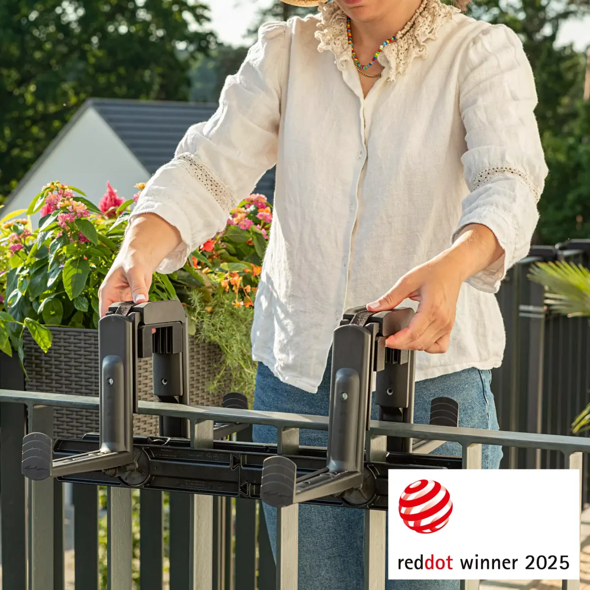 Uchwyt Balconera DUO został zaprojektowany tak, aby maksymalnie zwiększyć przestrzeń użytkową balkonu, umożliwiając jednoczesne zawieszenie dwóch skrzynek balkonowych BALCONERA. Jednej skierowanej w stronę wnętrza balkonu, drugiej na zewnątrz. Takie rozwiązanie sprawdza się szczególnie na mniejszych balkonach, gdzie każdy centymetr przestrzeni ma znaczenie, a jednocześnie zależy Ci na bogatych kompozycjach roślinnych.