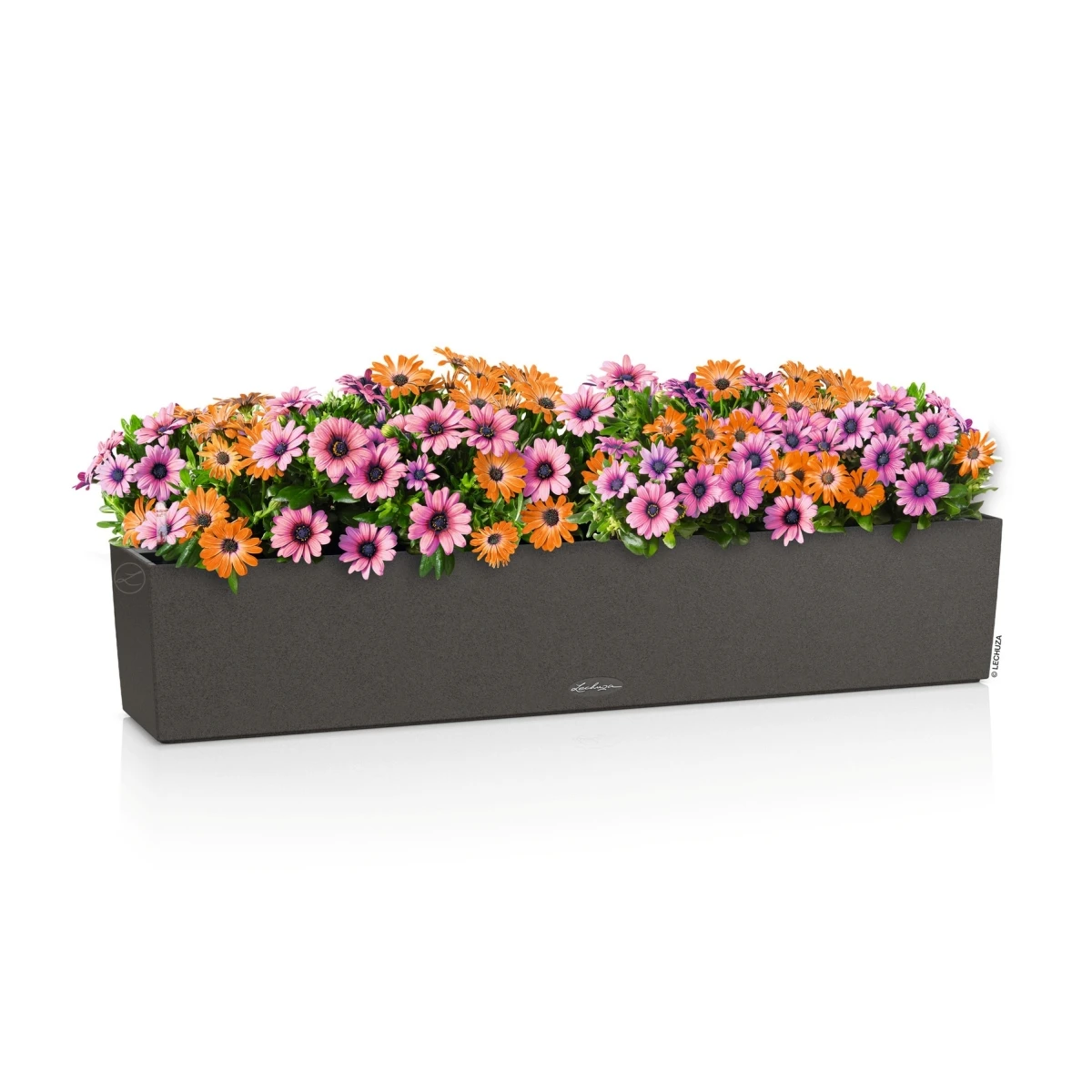 Lechuza BALCONERA Stone 100 w kolorze grafitowy czarny to długa doniczka balkonowa z systemem nawadniania, stworzona do nowoczesnych i wyrazistych aranżacji roślinnych na balkonach oraz tarasach. Strukturalna powierzchnia inspirowana kamieniem w głębokim, ciemnym odcieniu podkreśla zieleń roślin i nadaje przestrzeni elegancki, architektoniczny charakter. Doniczka jest lekka, odporna na warunki atmosferyczne i idealna do kompozycji z kwiatów, ziół oraz roślin sezonowych.