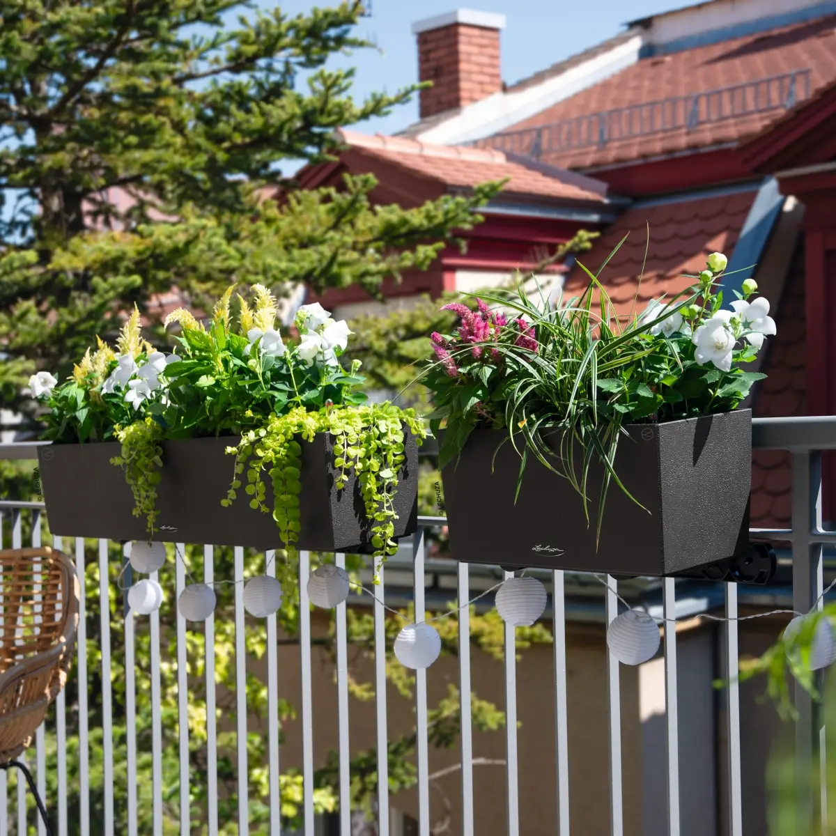 LECHUZA BALCONERA Stone 100 w kolorze grafitowy czarny to doniczka balkonowa z systemem nawadniania, stworzona z myślą o nowoczesnych i reprezentacyjnych balkonach oraz tarasach, gdzie liczy się mocny efekt wizualny i komfort użytkowania. Jej długa, prostokątna forma pozwala na budowanie efektownych kompozycji roślinnych wzdłuż balustrad i ścian, a strukturalne wykończenie inspirowane kamieniem podkreśla architektoniczny charakter donicy. Głęboki grafitowy czarny kolor tworzy wyrazisty kontrast z zielenią roślin i jasnymi elewacjami.