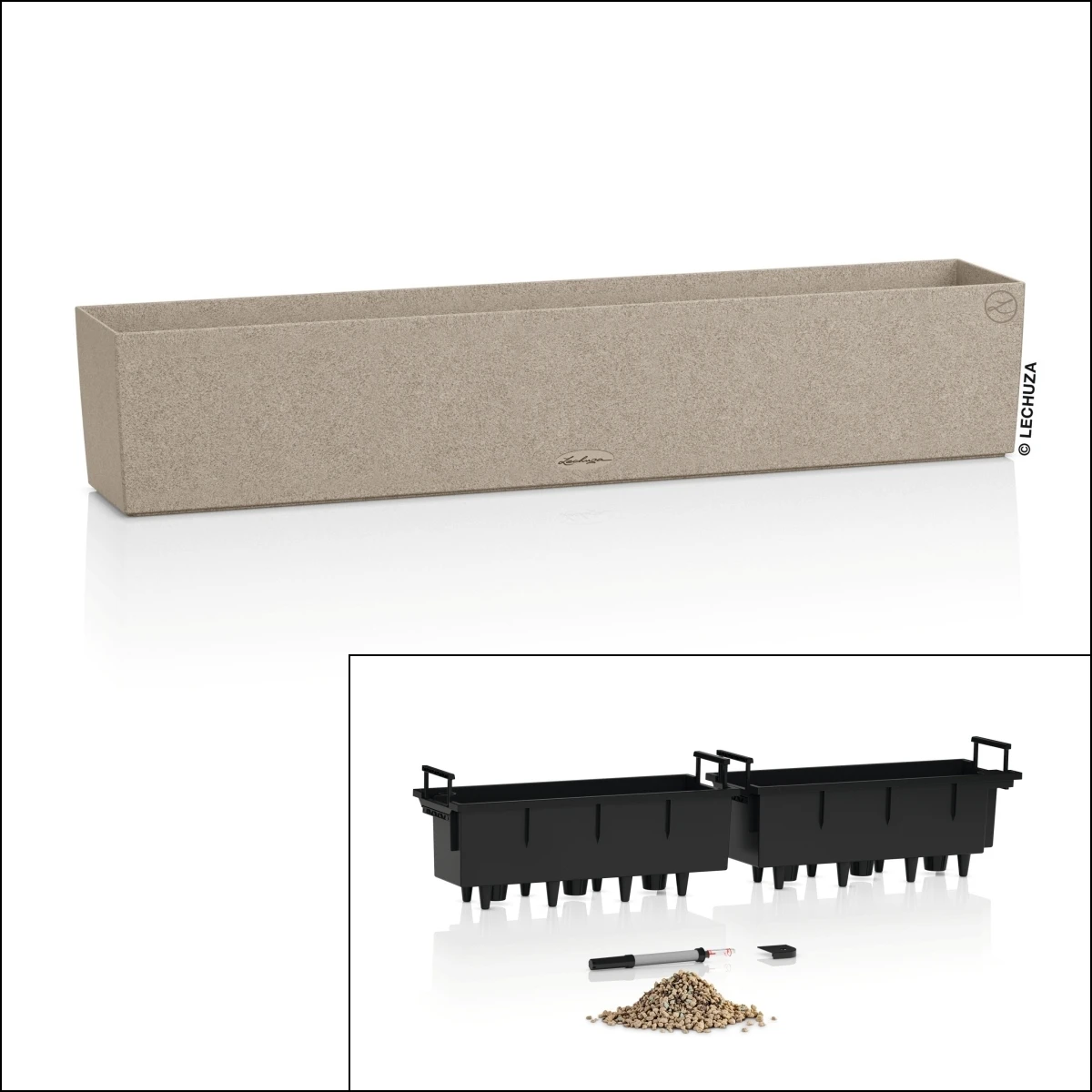 Lechuza BALCONERA Stone 100 w kolorze piaskowy beż to długa 100 cm doniczka balkonowa z systemem nawadniania, zaprojektowana do tworzenia efektownych, kompozycji roślinnych na balkonach i tarasach. Strukturalna powierzchnia inspirowana naturalnym kamieniem w jasnym, ciepłym odcieniu nadaje aranżacjom lekkości i elegancji, doskonale komponując się z nowoczesną architekturą. Doniczka jest lekka, odporna na warunki atmosferyczne i idealna do większych nasadzeń kwiatów, ziół, traw ozdobnych oraz roślin sezonowych.