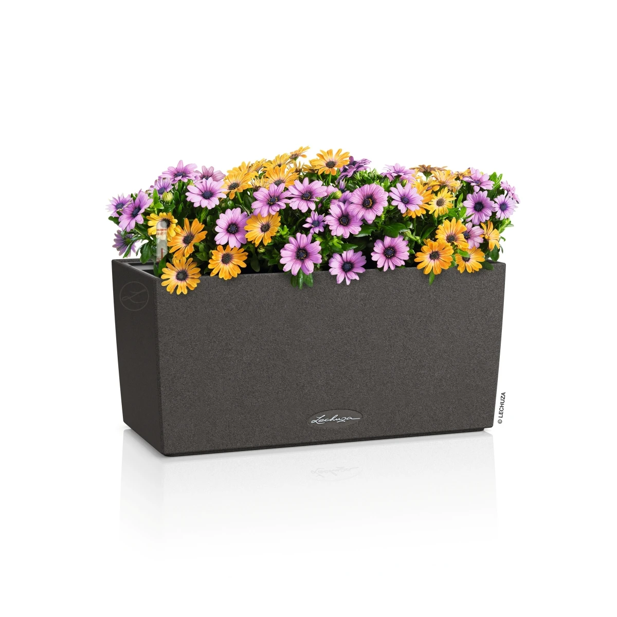 W BALCONERA Stone 40 grafitowy czarny system nawadniania LECHUZA umożliwia utrzymanie stabilnych warunków wilgotnościowych podłoża bez konieczności codziennego podlewania. Woda pobierana jest przez rośliny stopniowo, zgodnie z ich zapotrzebowaniem, co sprzyja zdrowemu rozwojowi systemu korzeniowego. Wskaźnik poziomu wody pozwala na wygodną kontrolę nawodnienia, bez naruszania estetyki donicy.