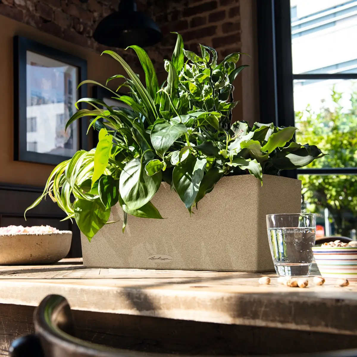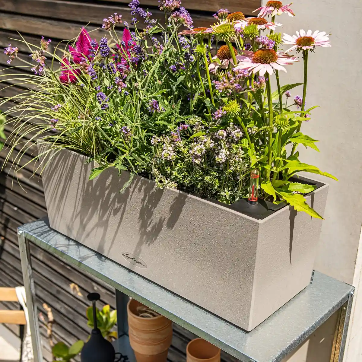 LECHUZA BALCONERA Stone 40 w kolorze piaskowy beż to doniczka balkonowa z systemem nawadniania, zaprojektowana z myślą o aranżacjach łączących nowoczesną formę z ciepłą, naturalną estetyką. Jej kompaktowa, prostokątna bryła umożliwia wygodne zagospodarowanie balustrad, parapetów i niewielkich balkonów, a strukturalne wykończenie Stone w beżowym odcieniu przywodzi na myśl naturalny kamień i kamienną powierzchnię. Donica tworzy spójną całość z zielenią roślin, drewnem i jasnymi elewacjami, wprowadzając do przestrzeni spokojny, harmonijny charakter.