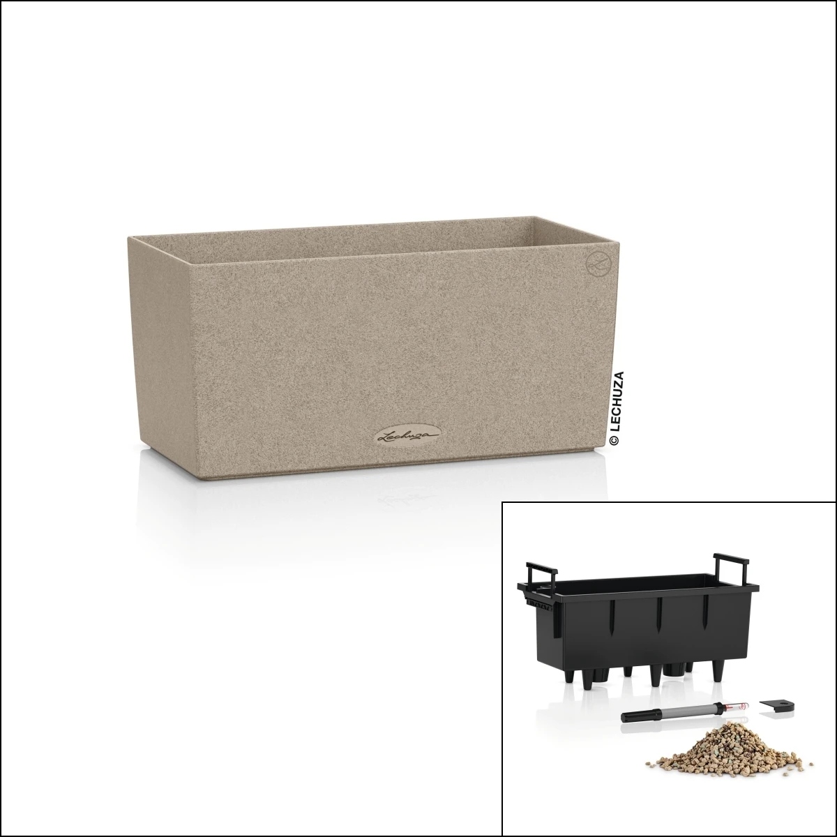 System nawadniania wspierający równomierne nawodnienie roślin, wyjmowany wkład ułatwiający sadzenie i pielęgnację, zbiornik na wodę ze wskaźnikiem poziomu, strukturalne wykończenie Stone w kolorze piaskowy beż, wysoka odporność na warunki atmosferyczne i promieniowanie UV, możliwość montażu na balustradzie balkonowej przy użyciu dedykowanych uchwytów (nie w zestawie).