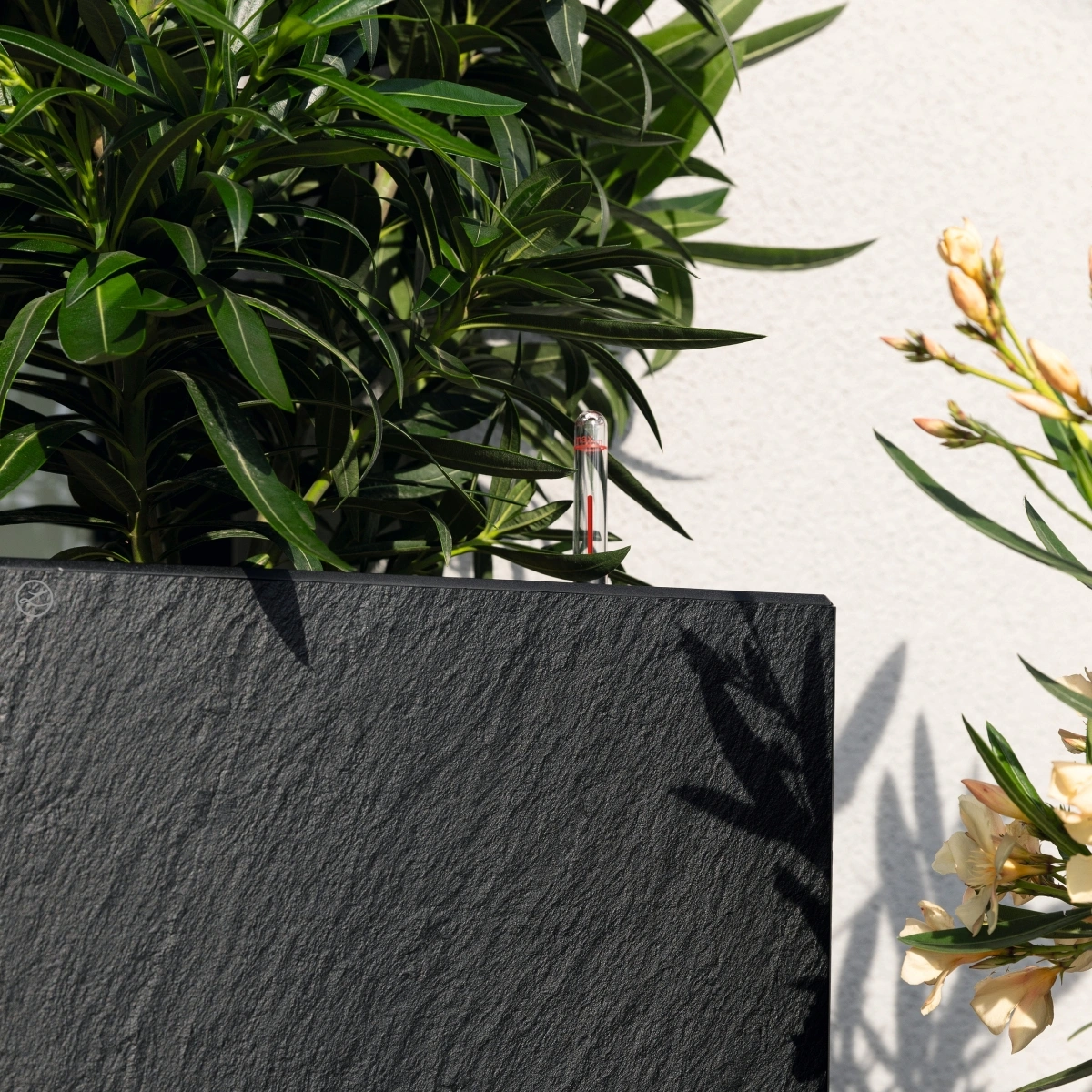 Widoczna i wyczuwalna struktura Slatestone przywodzi na myśl łupek i nadaje donicy trójwymiarowość. Sprawia, że jej powierzchnia reaguje na światło oraz cień. W połączeniu z ciemnoszarym kolorem faktura staje się bardziej wyrazista, tworząc wrażenie solidności i trwałości. Donica dobrze prezentuje się zarówno jako samodzielny element, jak i w zestawieniu z innymi materiałami o gładkich powierzchniach.