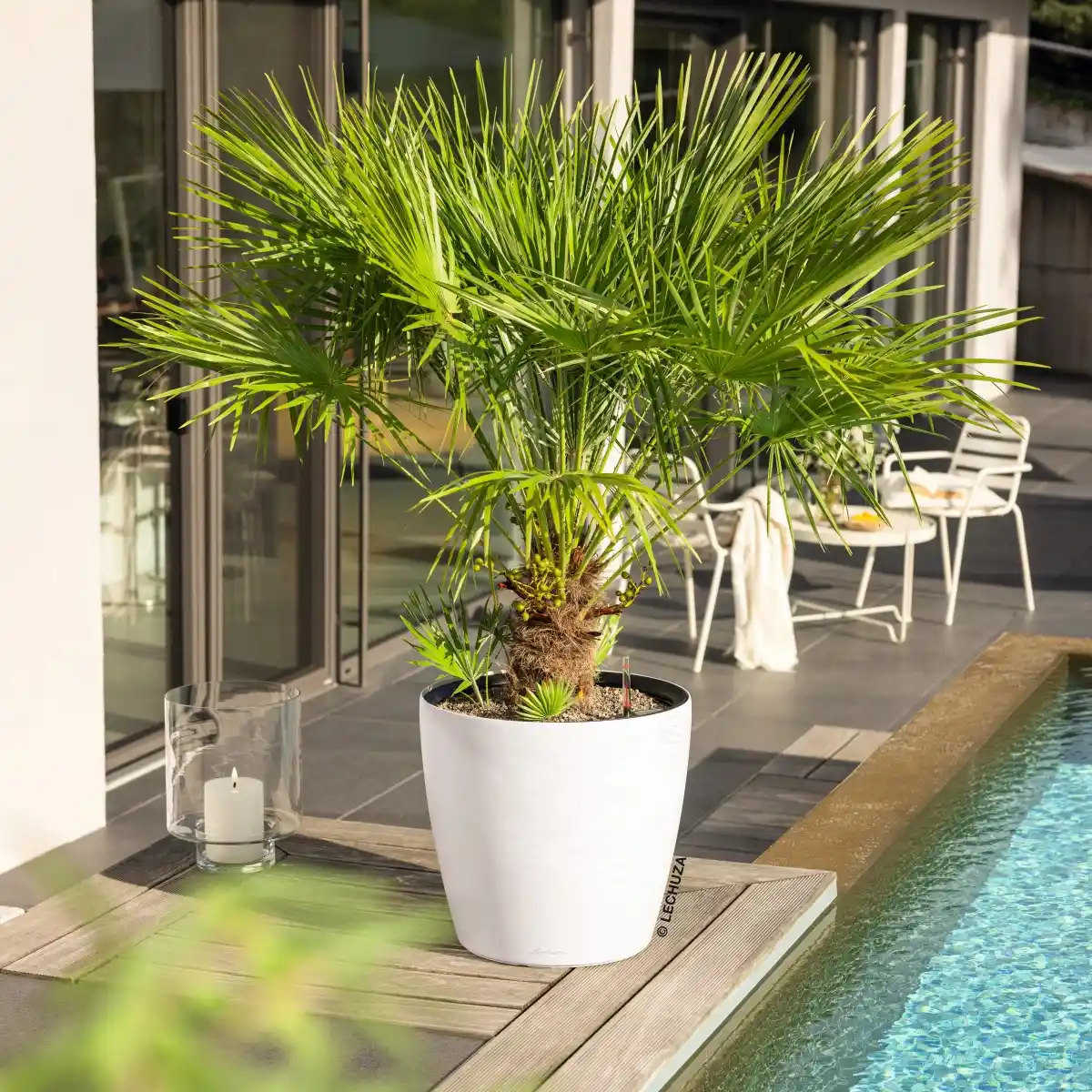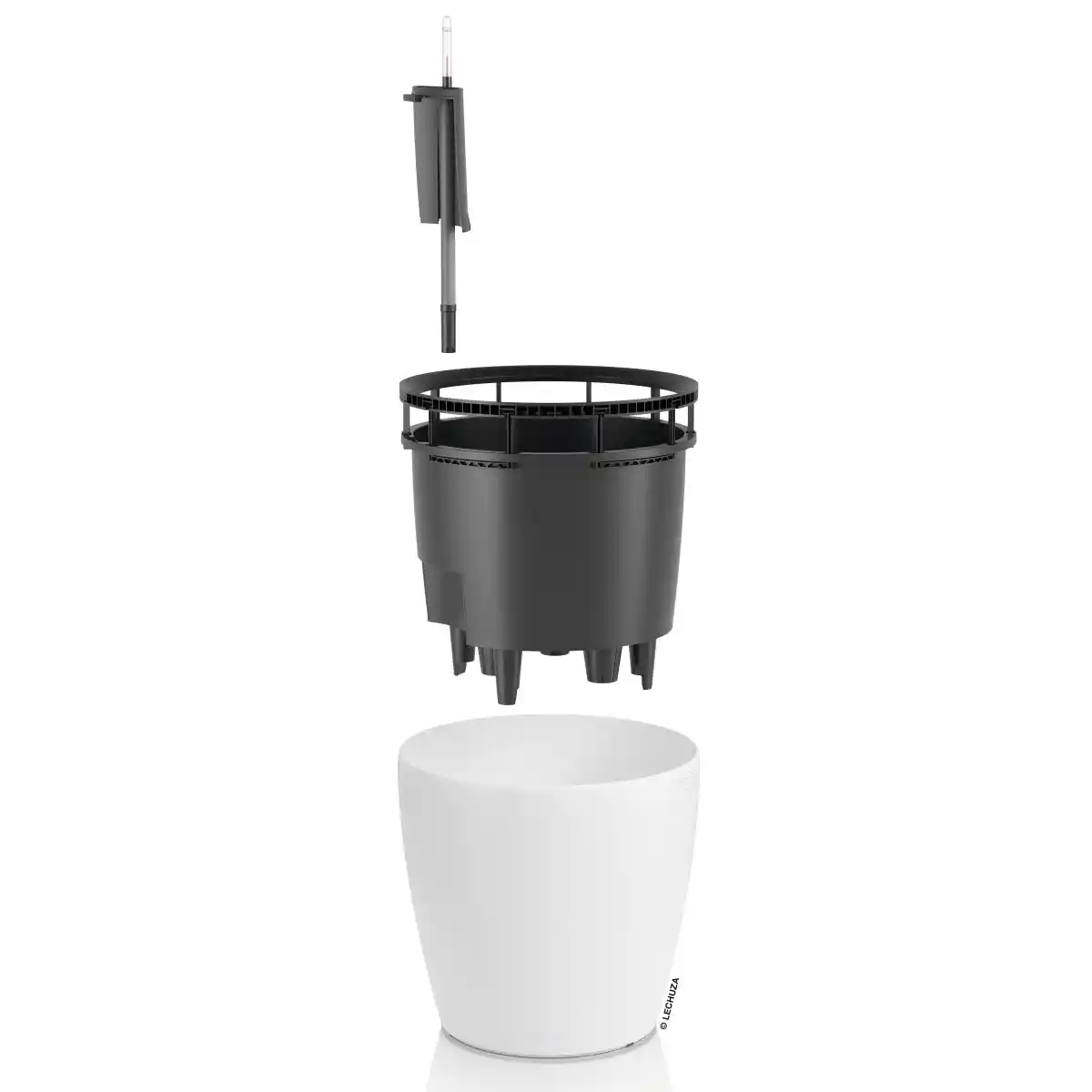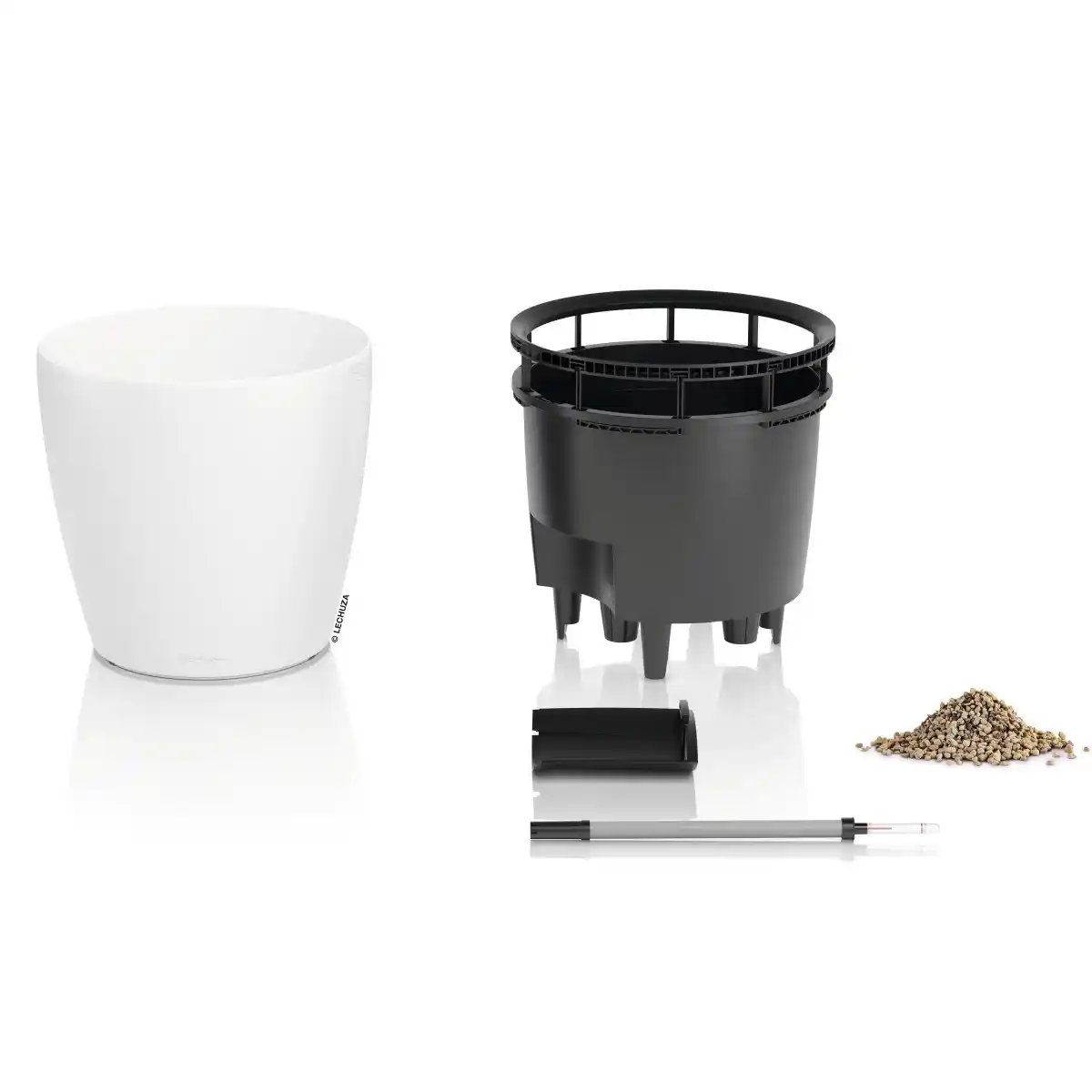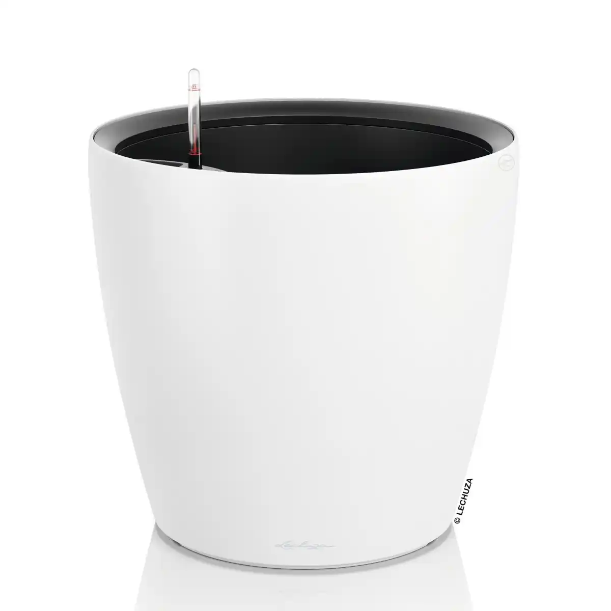 Model CLASSICO Color LS 50 wyposażony jest w zintegrowany system nawadniania LECHUZA, który stabilizuje poziom wilgotności podłoża poprzez stopniowe dostarczanie wody do strefy korzeniowej. Zasobnik w dolnej części donicy magazynuje wodę, którą roślina pobiera zgodnie ze swoim naturalnym zapotrzebowaniem, co sprzyja równomiernemu rozwojowi roślin i ogranicza ryzyko przelania lub przesuszenia podłoża. W połączeniu z wyjmowanym wkładem rozwiązanie to zapewnia wysoki komfort użytkowania, szczególnie przy większych roślinach wymagających okresowej pielęgnacji.