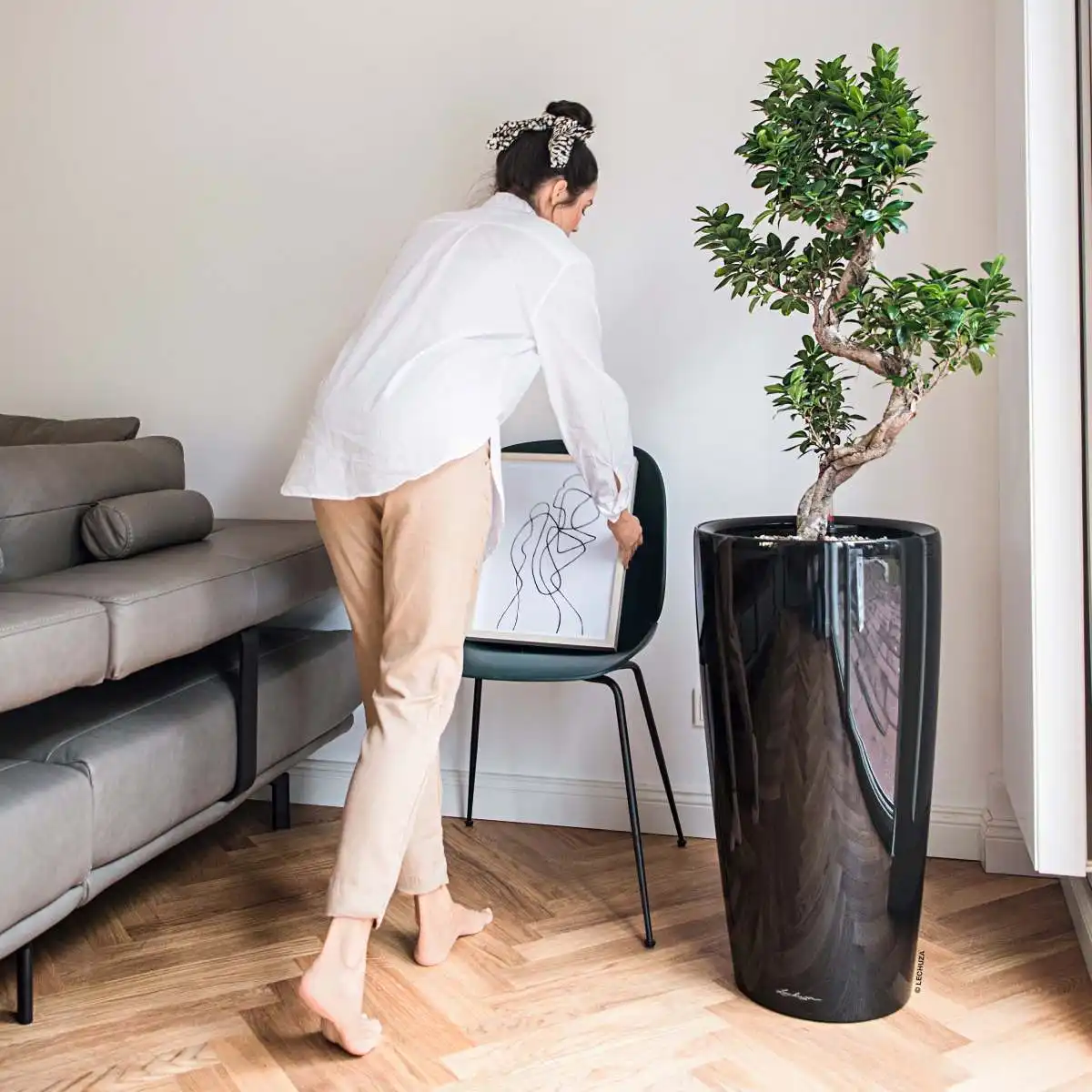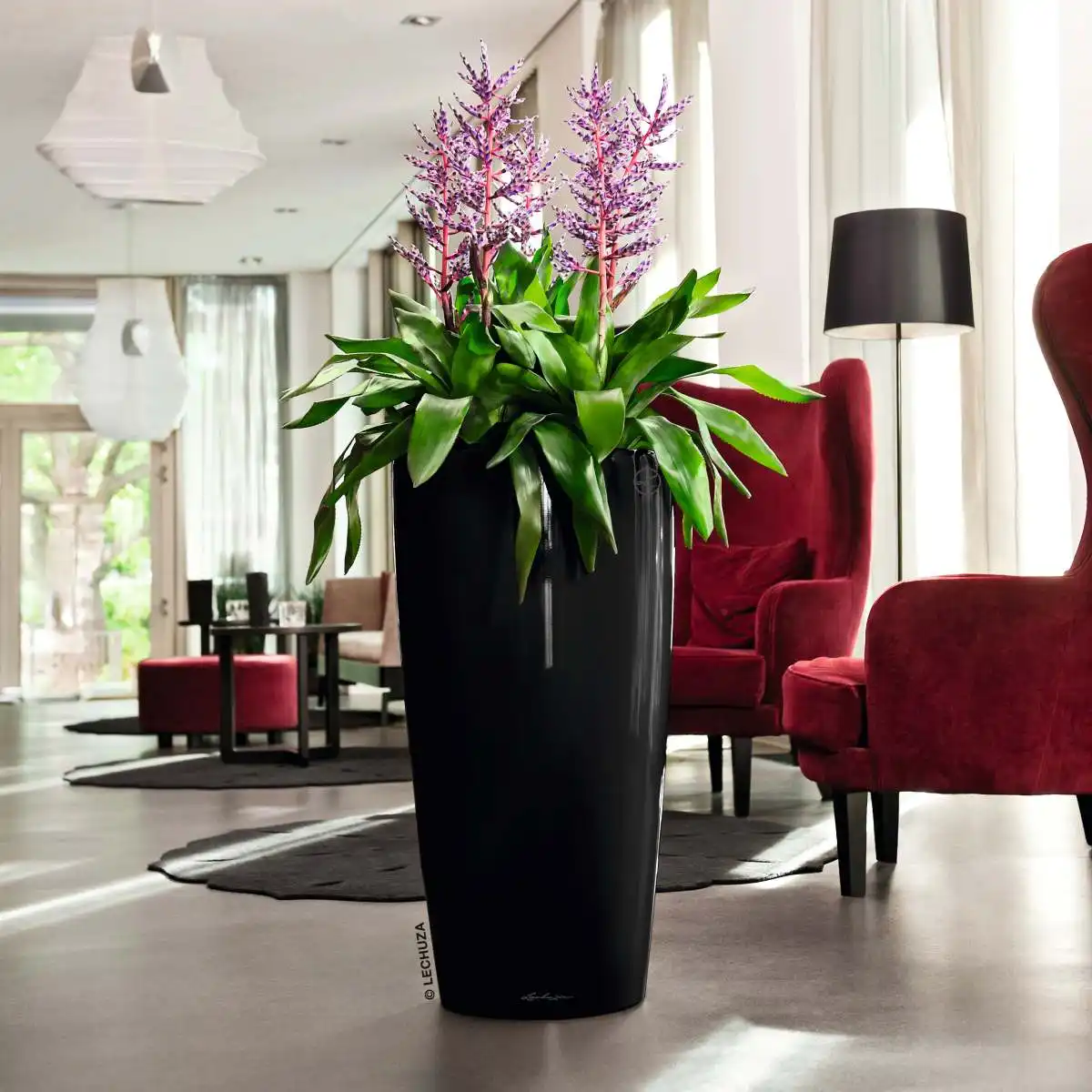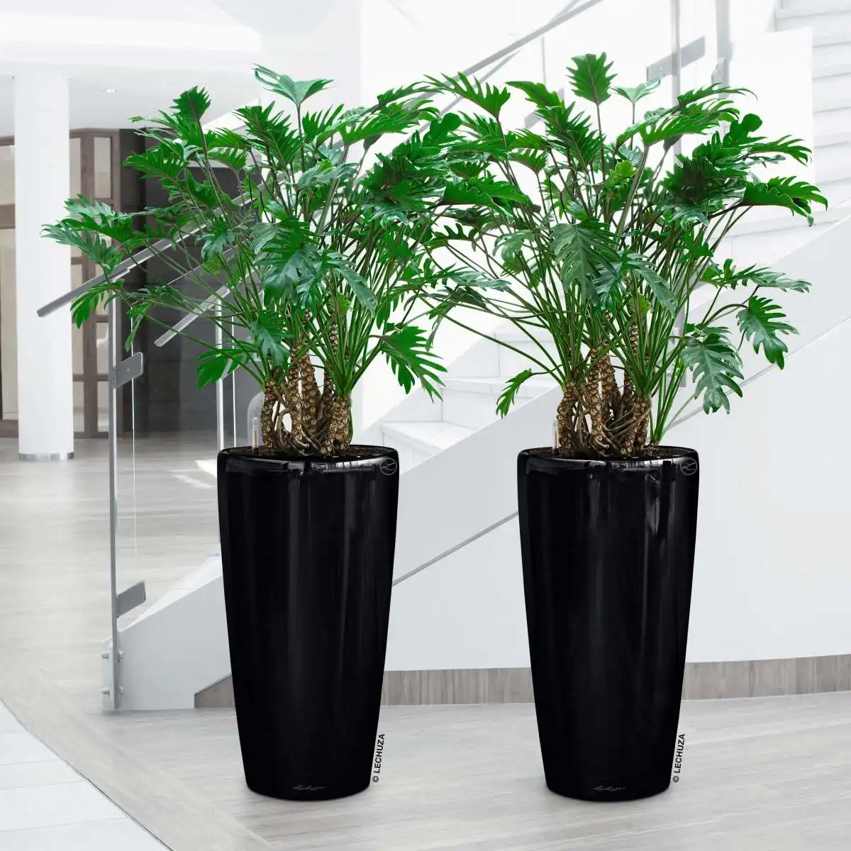 Donice marki Lechuza wyróżniają się ciekawym designem i praktycznym systemem nawadniającym korzenie roślin. Model Rondo to smukła, wysoka doniczka o okrągłym dnie. Średnica donicy wynosi 40 cm, a jej wysokość to 75 cm. Tego typu donica sprawdzi się w przypadku pojedynczych roślin zielonych czy ozdobnych traw. Wkład, który znajduje się wewnątrz donicy, jest wyjmowany i znacznie ułatwia przesadzanie dużych roślin. Doniczka z serii Rondo może być stosowana zarówno w przestronnym domu, biurze, ale także w ogrodzie i na tarasie, niezależnie od pory roku. Donica wykonana jest z trwałego materiału mrozoodpornego. System nawadniający rośliny wbudowany w donicę sprawia, że można je podlewać znacznie rzadziej. Składa się na niego wskaźnik poziomu wody, miejsce na jej zapas oraz otwór do usuwania wody, na przykład po mocnym deszczu. Głęboka czerń świetnie sprawdzi się w przypadku większych roślin o wyrazistych barwach takich jak Fitonia, czy Caladium.