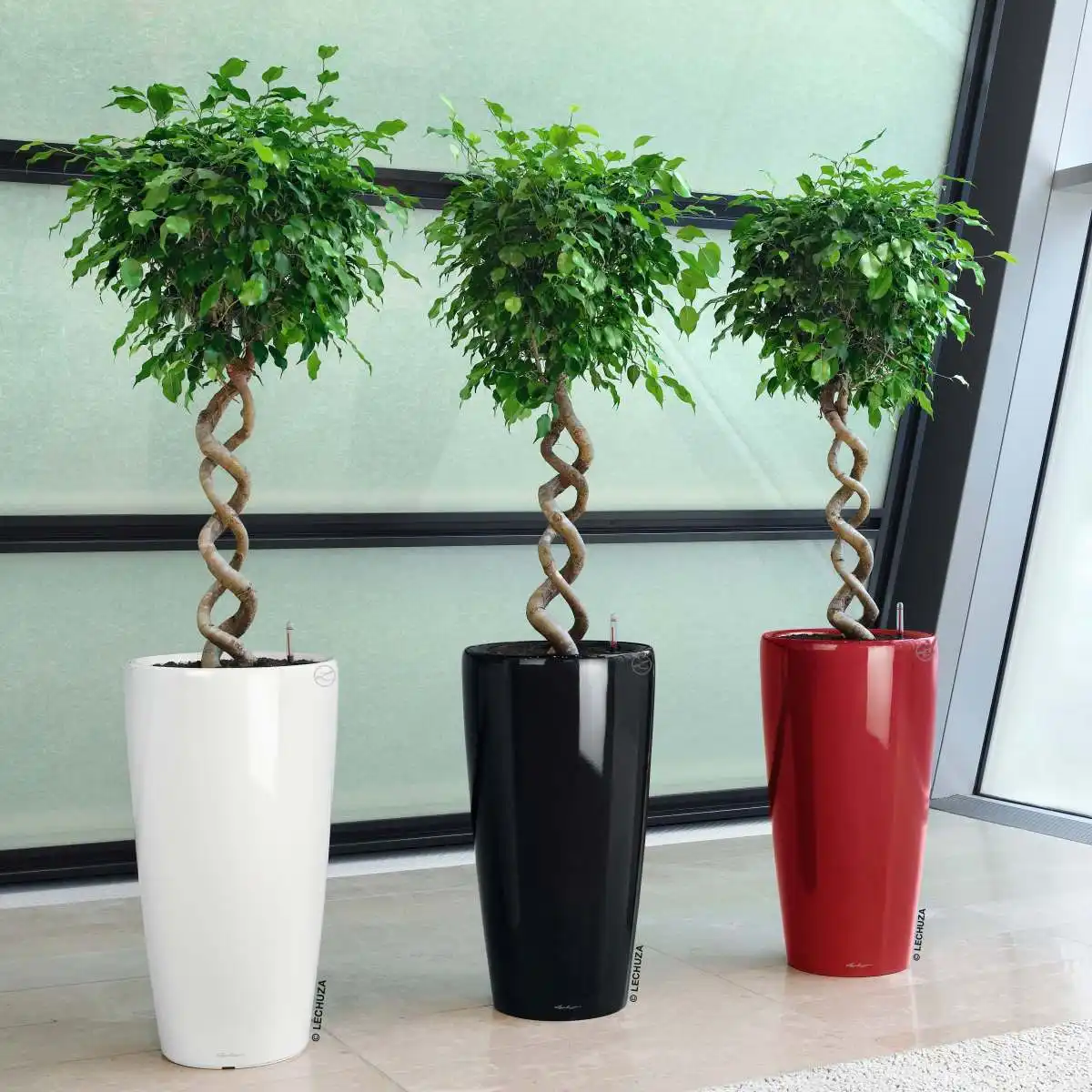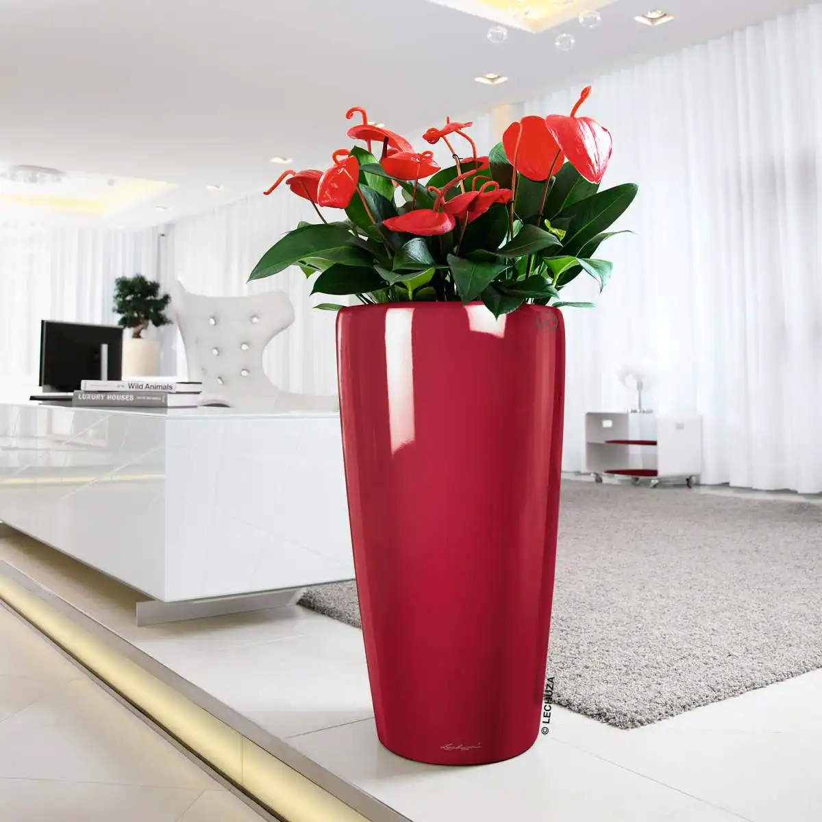 Donice marki Lechuza wyróżniają się ciekawym designem i praktycznym systemem nawadniającym korzenie roślin. Model Rondo to smukła, wysoka doniczka o okrągłym dnie. Średnica donicy wynosi 40 cm, a jej wysokość to 75 cm. Tego typu donica sprawdzi się w przypadku pojedynczych roślin zielonych czy ozdobnych traw. Wkład, który znajduje się wewnątrz donicy, jest wyjmowany i znacznie ułatwia przesadzanie dużych roślin. Doniczka z serii Rondo może być stosowana zarówno w przestronnym domu, biurze, ale także w ogrodzie i na tarasie, niezależnie od pory roku. Donica wykonana jest z trwałego materiału mrozoodpornego. System nawadniający rośliny wbudowany w donicę sprawia, że można je podlewać znacznie rzadziej. Składa się na niego wskaźnik poziomu wody, miejsce na jej zapas oraz otwór do usuwania wody, na przykład po mocnym deszczu. Czerwona, połyskująca doniczka przypomina donice ceramiczne i jest dobrym wyborem jeśli potrzebujemy mocnego akcentu. Kolor dobrze sprawdzi się w przypadku roślin z duża ilością liści, takich jak Monstera, Skrzydłokwiat olbrzymi, czy Palma Areka.