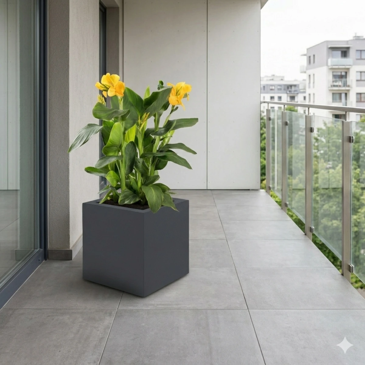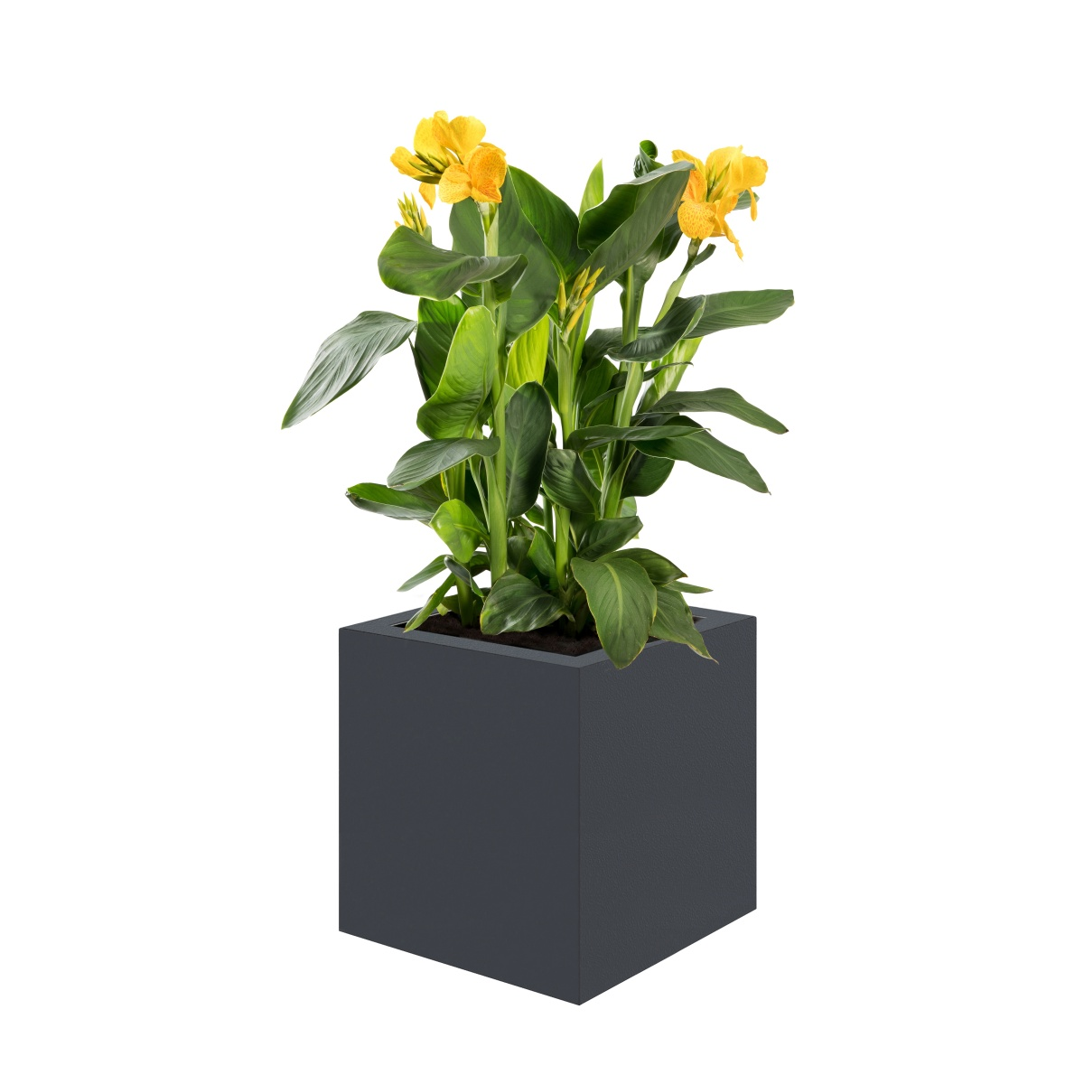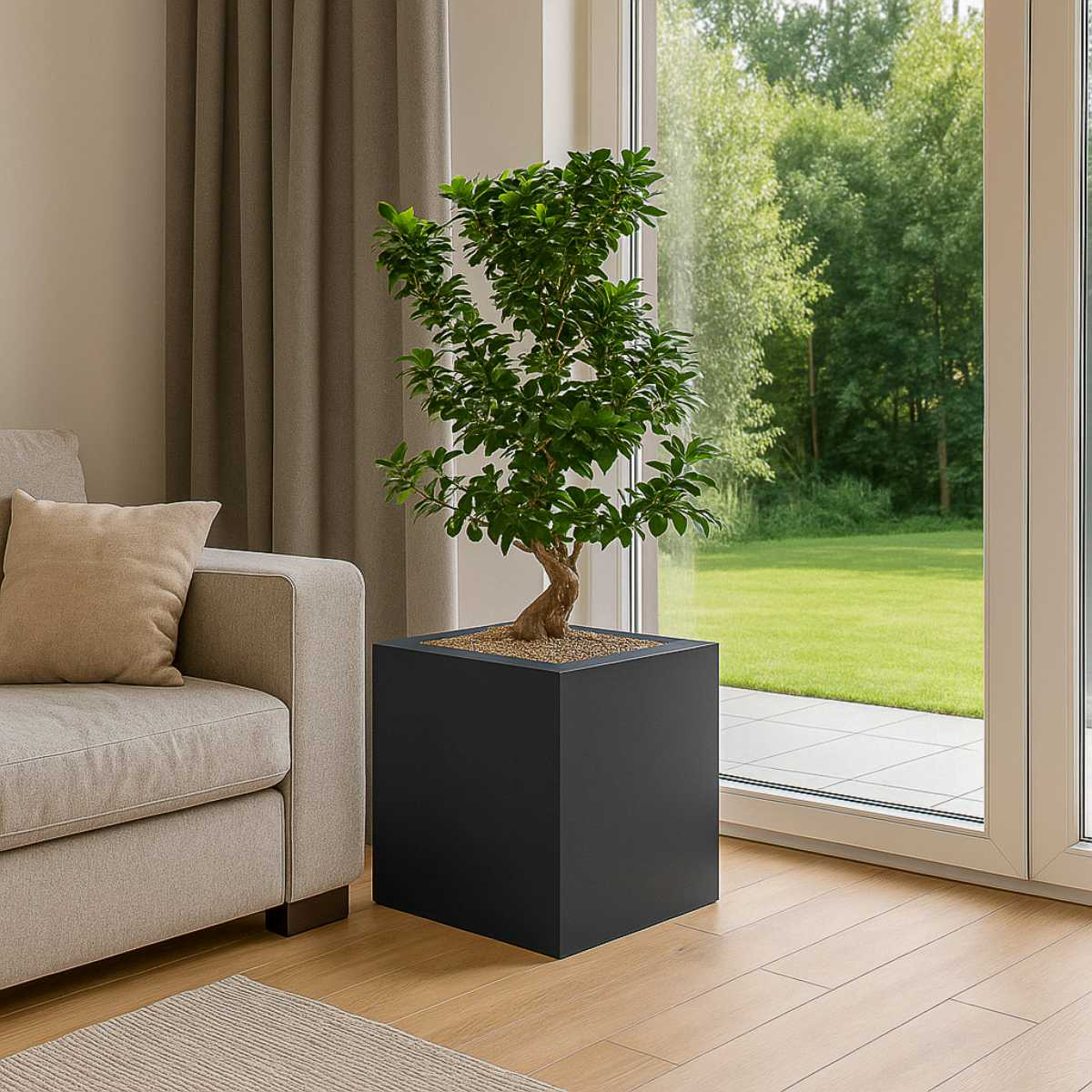 Wymiary 40x40x40 cm sprawiają, że donica jest łatwa w aranżacji nawet w ograniczonej przestrzeni. Jej regularna forma pozwala na ustawienie przy ścianie, w narożniku lub w centralnym punkcie kompozycji. Antracytowy, matowy kolor podkreśla nowoczesny charakter i dobrze kontrastuje z zielenią roślin, dzięki czemu donica pełni nie tylko funkcję użytkową, ale również estetyczną.