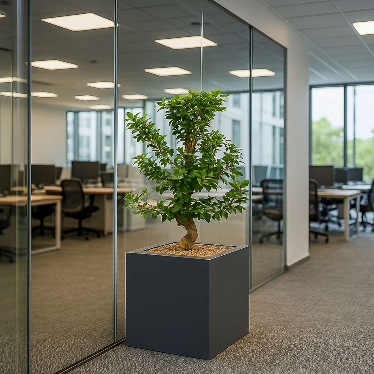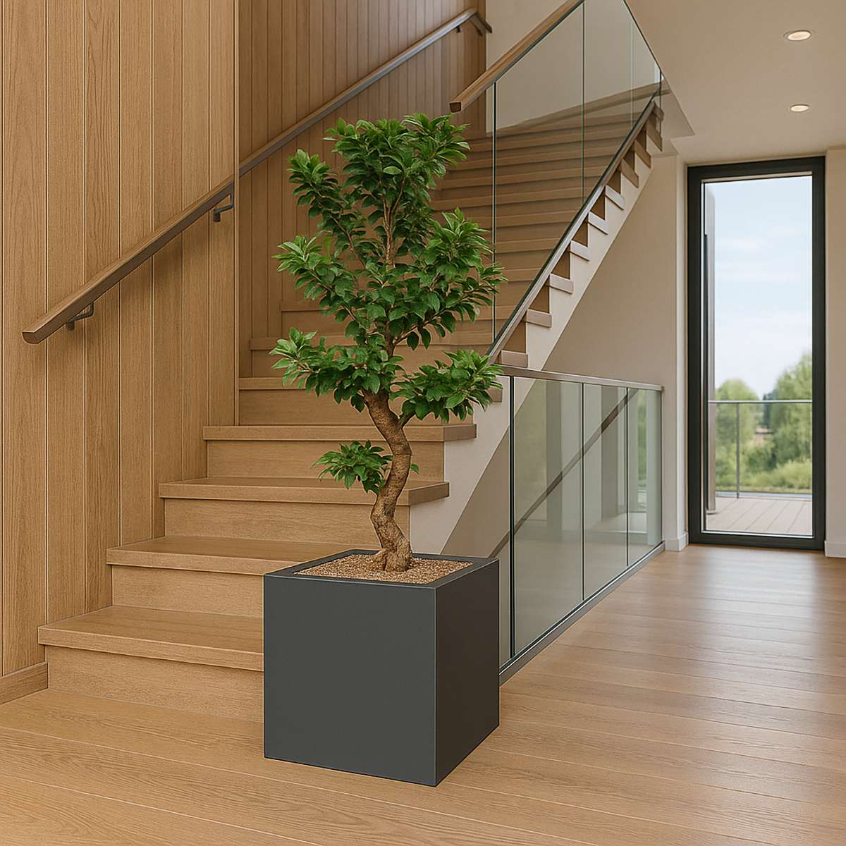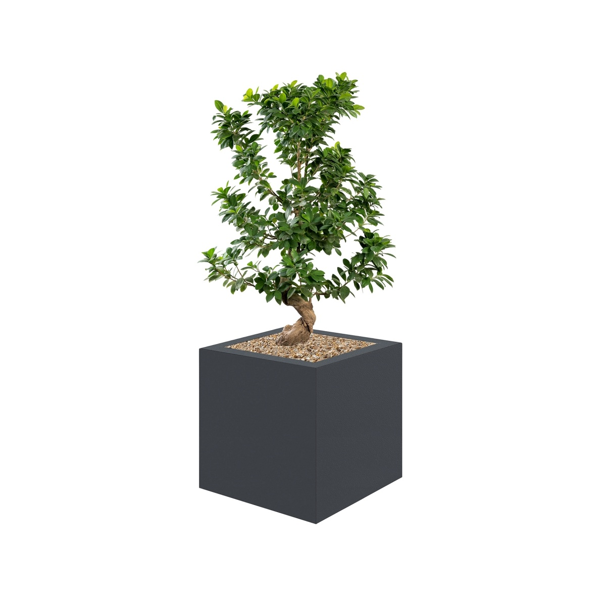 Wymiary 40x40x40 cm sprawiają, że donica jest łatwa w aranżacji nawet w ograniczonej przestrzeni. Jej regularna forma pozwala na ustawienie przy ścianie, w narożniku lub w centralnym punkcie kompozycji. Antracytowy, matowy kolor podkreśla nowoczesny charakter i dobrze kontrastuje z zielenią roślin, dzięki czemu donica pełni nie tylko funkcję użytkową, ale również estetyczną.