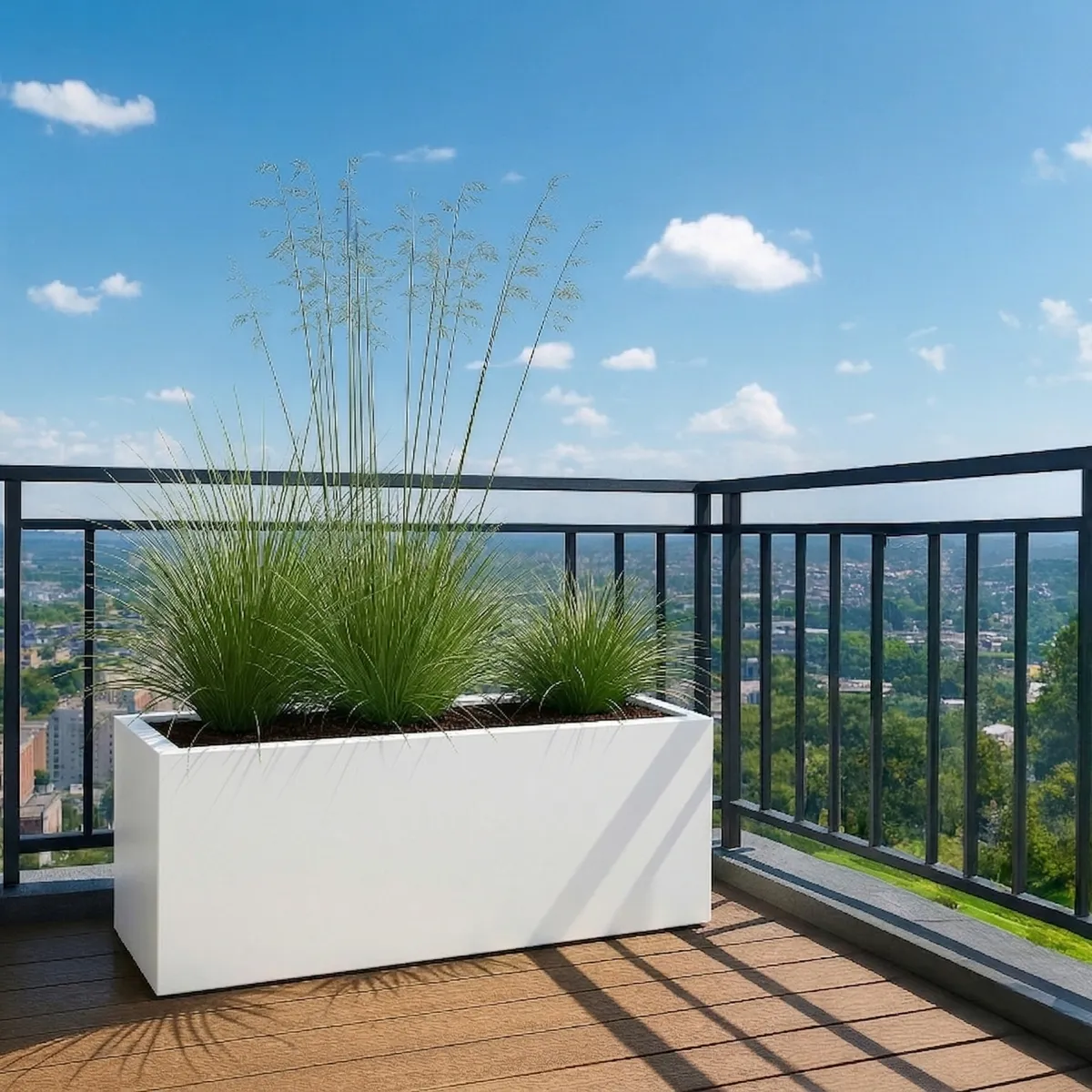 Kolor biały mat (zbliżony do RAL 9003) to wybór, który wnosi do przestrzeni świeżość i ponadczasową elegancję. Jasna powierzchnia odbija światło, rozjaśniając otoczenie i optycznie powiększając przestrzeń. Biała donica tarasowa LINEO idealnie eksponuje rośliny. Zarówno intensywnie zielone liście, jak i kolorowe kwiaty, tworząc kontrast, który przyciąga wzrok i buduje estetyczną równowagę.