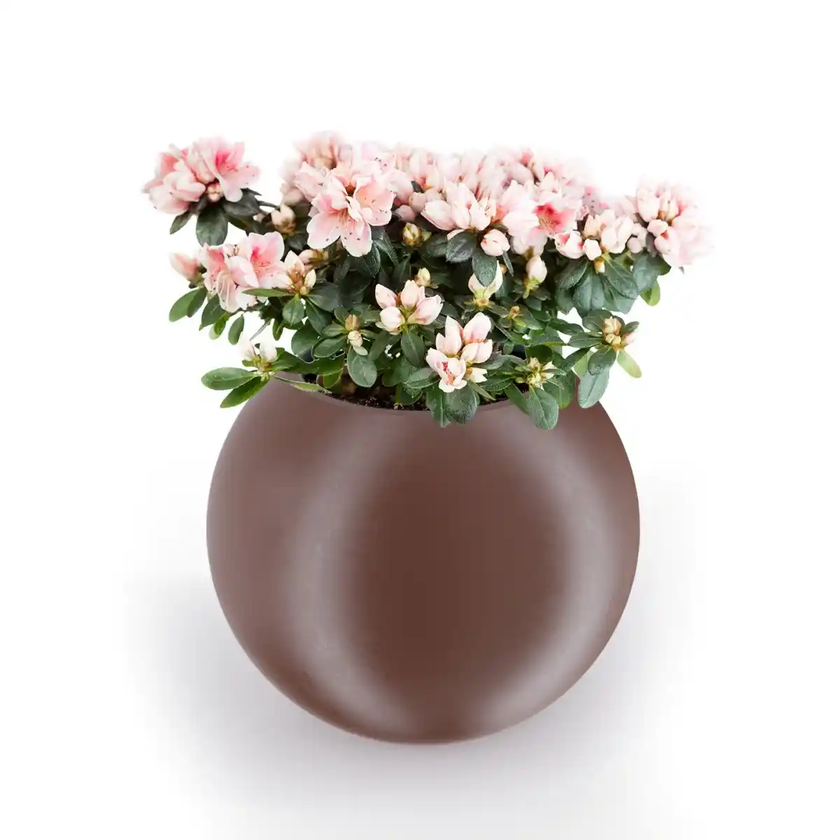 Donica JUPITER PL-JU64 w głębokim odcieniu brązu to duża, kulista bryła o wysokości 64 cm i średnicy 75,5 cm. Jej proporcje są harmonijne i stabilne wizualnie, dzięki czemu forma prezentuje się solidnie i prestiżowo. To model, który organizuje przestrzeń i przyciąga uwagę bez przesadnej ostentacji.