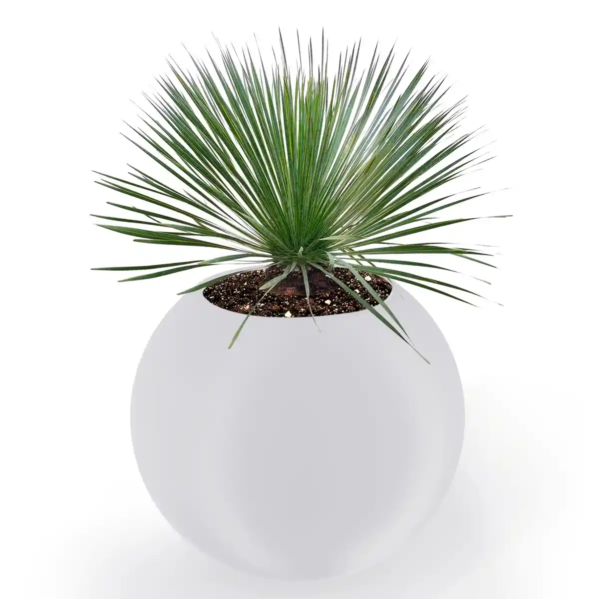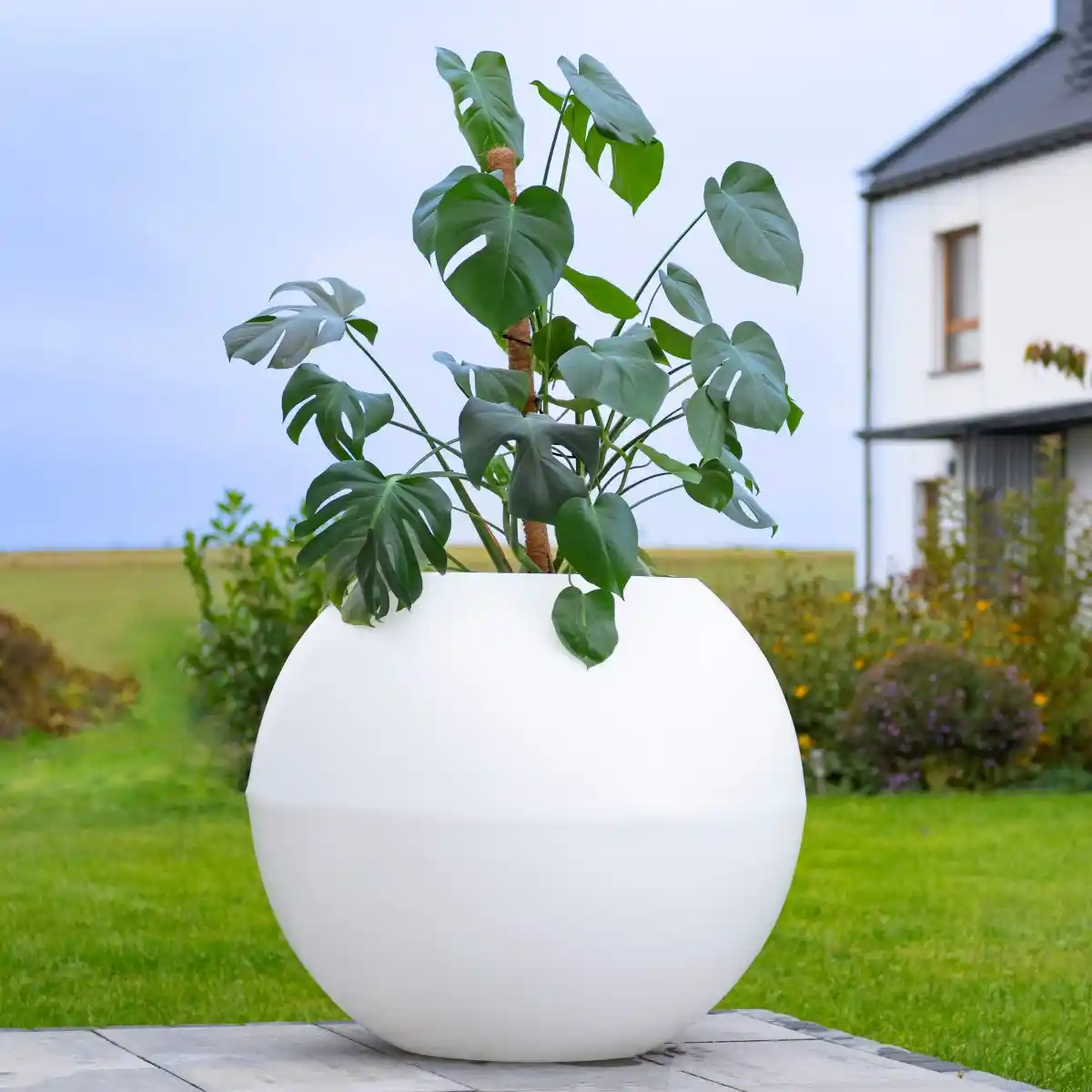 Biel nadaje tej potężnej formie lekkości i świeżości. Jasna, czysta powierzchnia podkreśla elegancki charakter kuli i doskonale eksponuje zieleń roślin - od intensywnych liści tropikalnych po delikatne trawy ozdobne. To kolor, który rozświetla przestrzeń i harmonijnie wpisuje się w nowoczesne tarasy, ogrody rezydencjonalne oraz reprezentacyjne strefy wejściowe.
