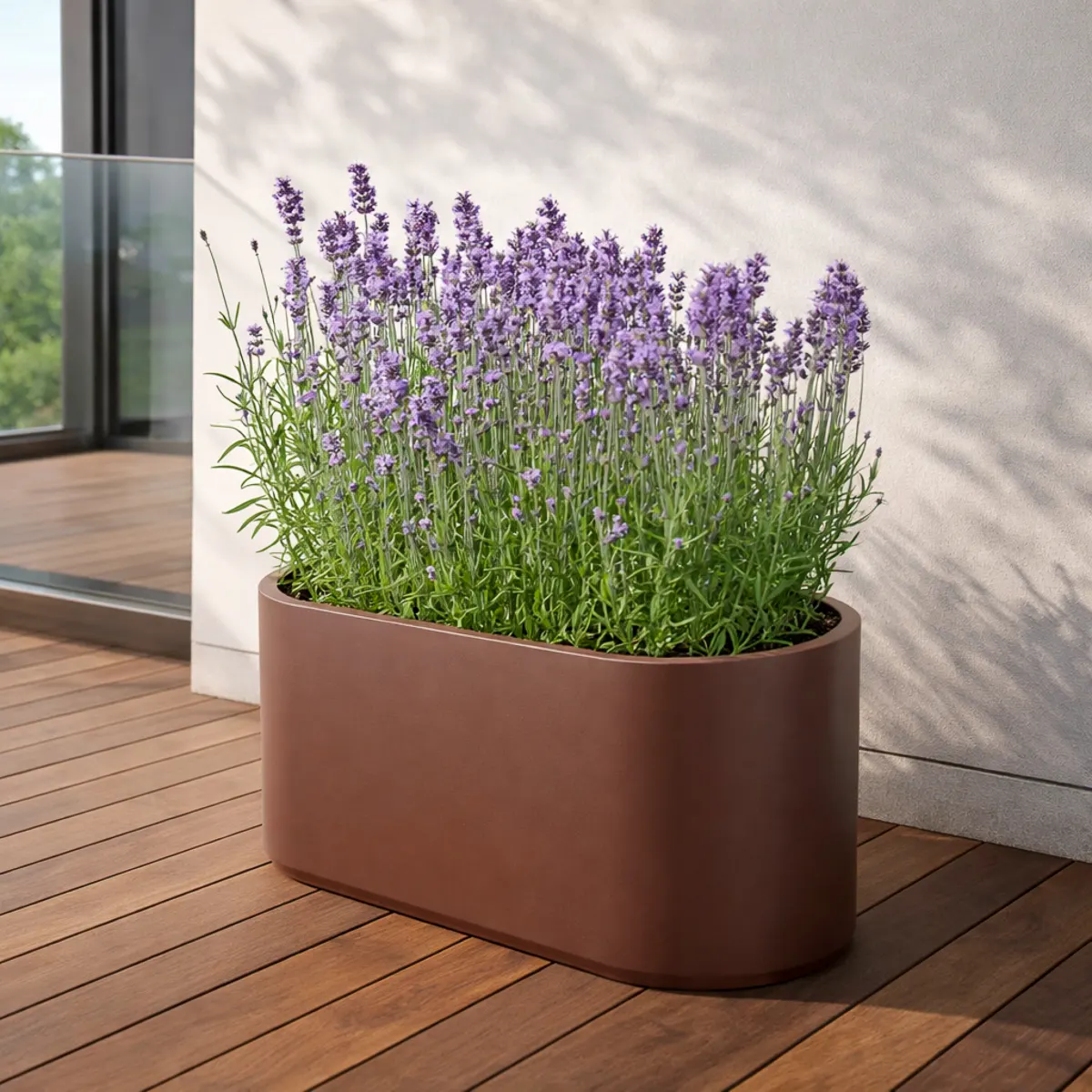 Brązowa wersja LETO 42 pozwala zachować jednolity styl pomiędzy wnętrzem a przestrzenią zewnętrzną. Donica dobrze prezentuje się w salonach, oranżeriach, na tarasach i patio, tworząc naturalne przejście pomiędzy różnymi strefami. Gładka powierzchnia ułatwia utrzymanie estetycznego wyglądu w codziennym użytkowaniu.