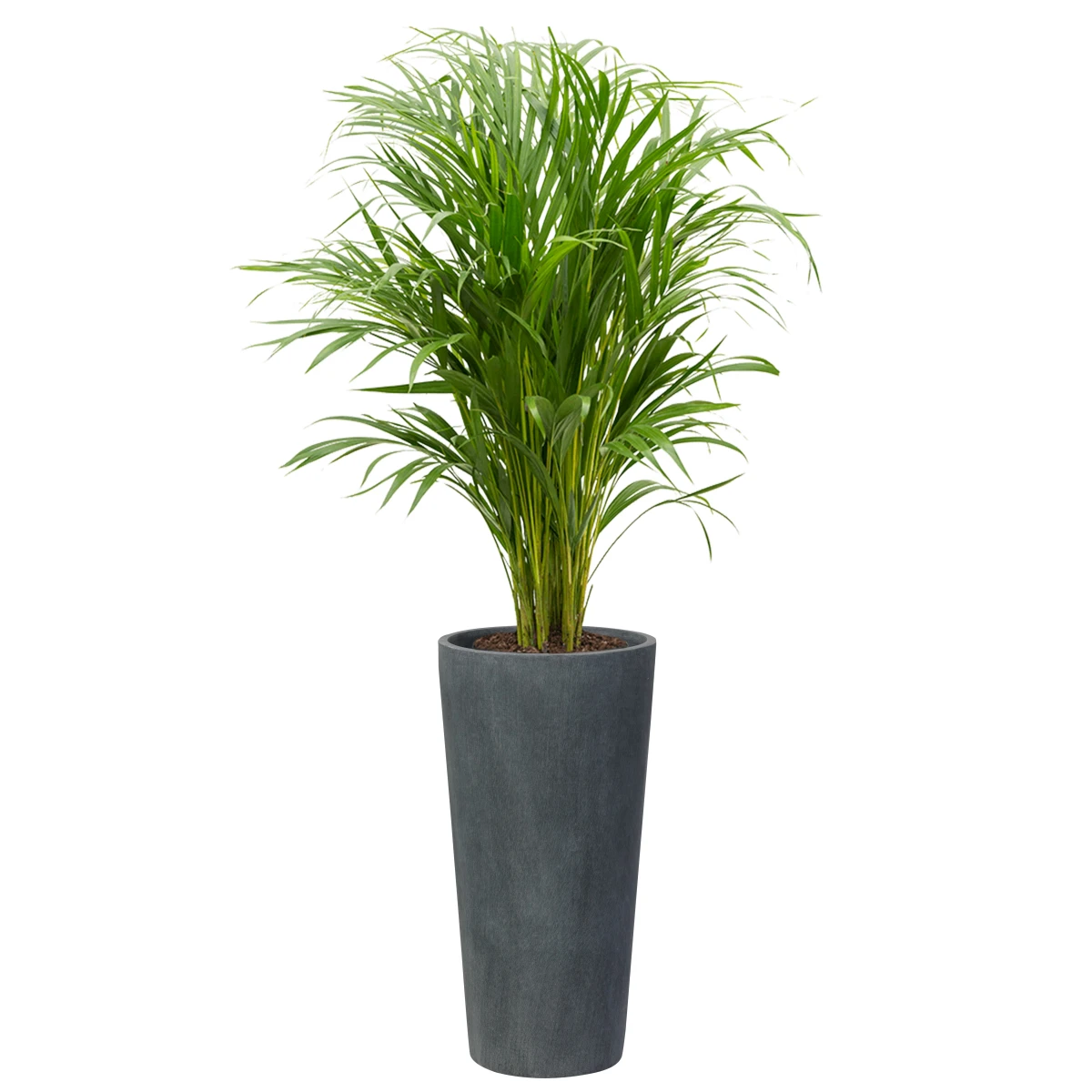 Model D208D ma średnicę 38 cm i wysokość 76 cm. Dzięki pełnej pojemności około 69 litrów (bez półki wewnętrznej), donica sprawdzi się zarówno jako pojemnik do uprawy dużych roślin pokojowych, jak i na zewnątrz – na tarasie lub balkonie. Jej stożkowa forma i subtelna faktura powierzchni nadają aranżacjom elegancji, a przy tym nie dominują przestrzeni. Wypełniona ziemią donica staje się stabilna i odporna na wiatr, co czyni ją idealnym rozwiązaniem dla wysokich roślin ozdobnych, takich jak draceny, palmy Areca czy kentie.