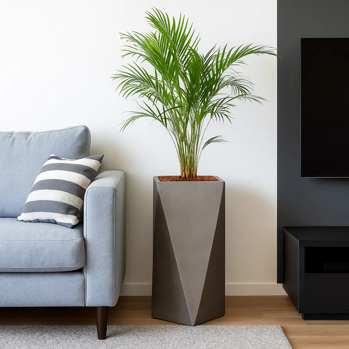 Donica D373B w kolorze szary matDonica D373B 34x34x80 cm szary matWymiary donicy D373BPalma chamedora w szarej donicy D373BGórna krawędź donicy D373B w kolorze szary matDolna krawędź donicy D373B w kolorze szary mat