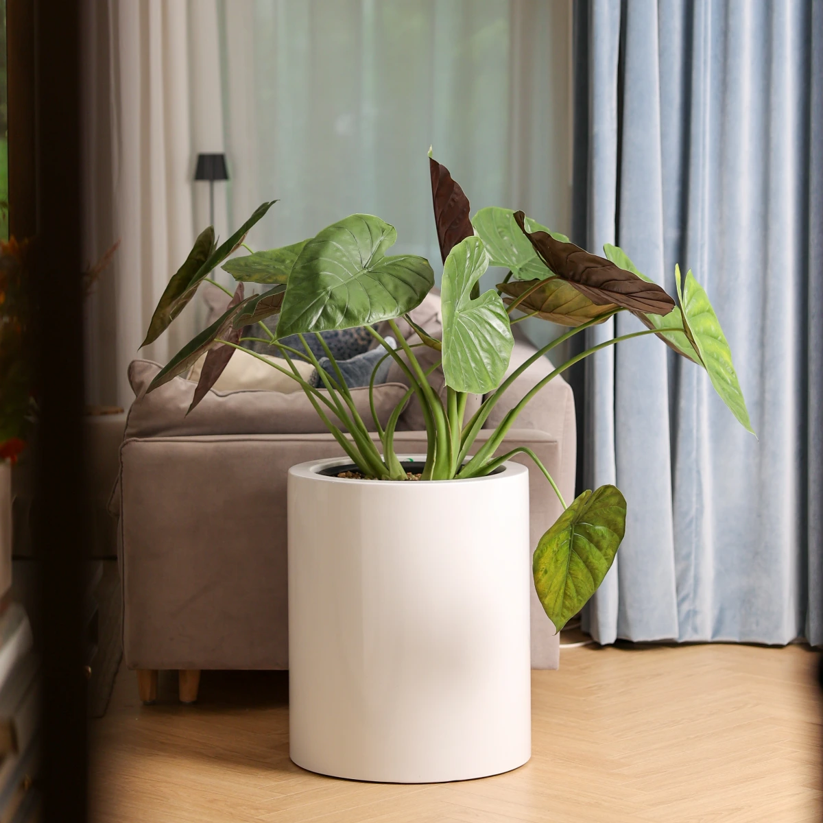 Na zdjęciu widzimy donicę ZADORA D901N w kolorze biały połysk, która doskonale odnajduje się w ciepłym, nowoczesnym salonie. Ustawiona przy sofie i wypełniona okazałą alokazją, wprowadza do przestrzeni naturalny akcent i świeżą energię. Lśniąca powierzchnia donicy pięknie odbija światło dzienne, podkreślając zieleń liści i dodając wnętrzu lekkości. To przykład, jak elegancka, prosta forma może stać się subtelnym, ale wyrazistym elementem wystroju, łączącym naturę z nowoczesnym designem.