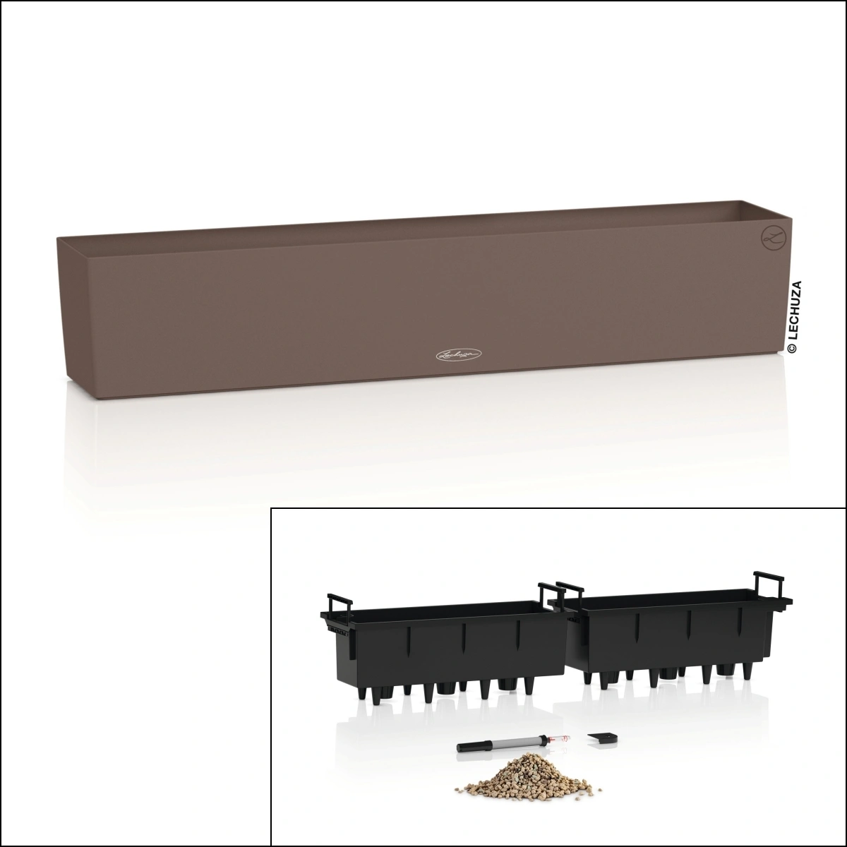 Zintegrowany system nawadniania LECHUZA zapewniający stały dostęp do wody, dwa niezależne wkłady ułatwiające organizację nasadzeń, zbiornik na wodę z precyzyjnym wskaźnikiem, matowe wykończenie w kolorze muszkatołowy brąz, odporność na zmienne warunki pogodowe, możliwość montażu na balustradzie przy użyciu dedykowanych uchwytów (brak w zestawie).