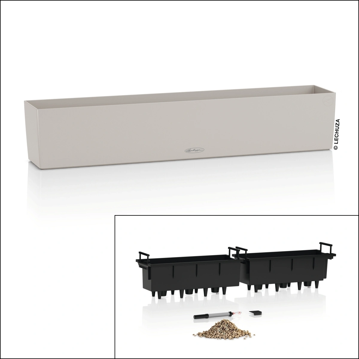 BALCONERA Color 100 piaskowy brąz to donica balkonowa z systemem nawadniania LECHUZA, przeznaczona do aranżacji balkonów, tarasów i parapetów. Dwa wyjmowane wkłady oraz zbiornik na wodę ze wskaźnikiem poziomu ułatwiają pielęgnację roślin i pomagają utrzymać ich dobrą kondycję. Jasny odcień brązu nadaje aranżacji spokojny, naturalny charakter i dobrze komponuje się z zielenią.