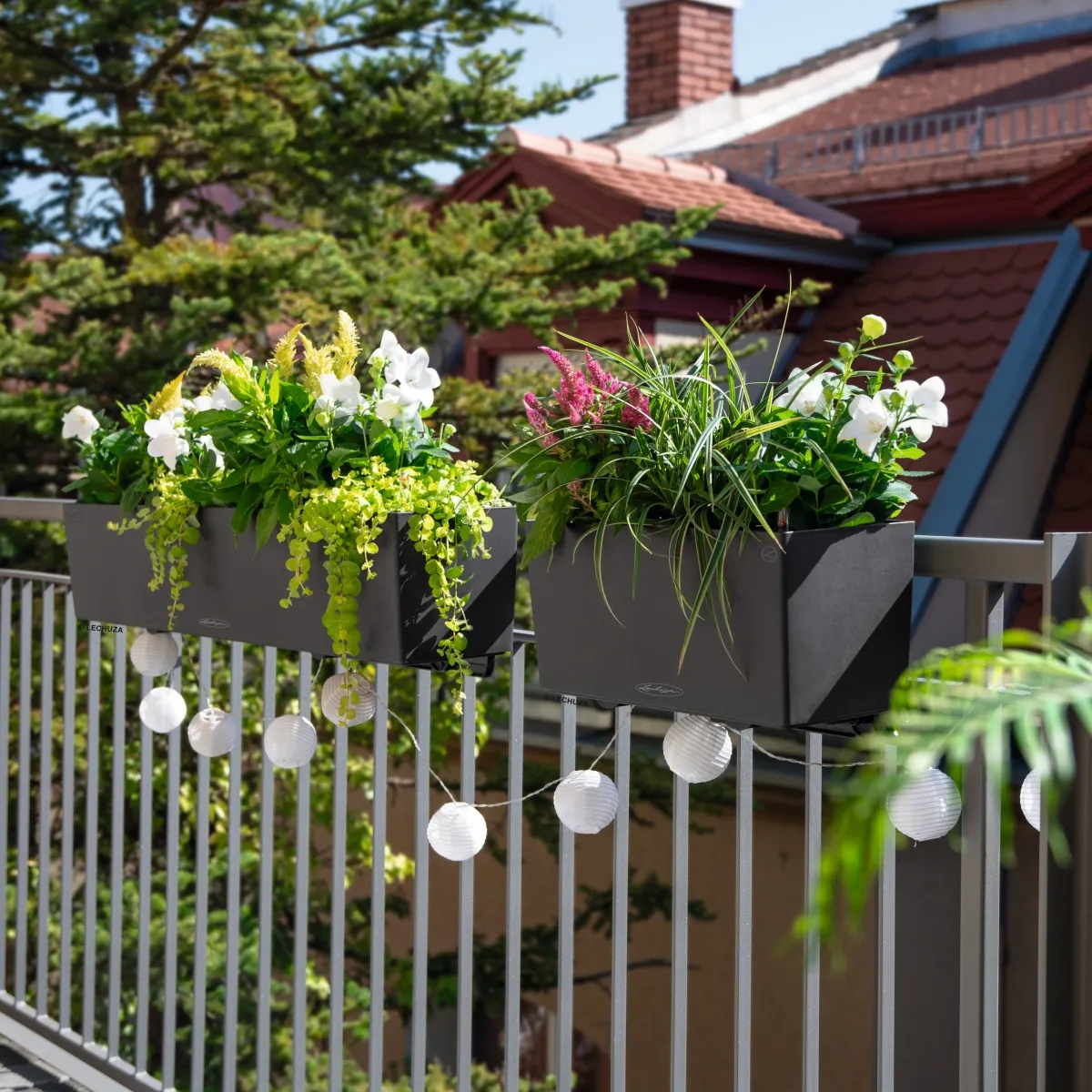 LECHUZA BALCONERA Color 100 szary łupek to donica balkonowa z systemem nawadniania, przeznaczona do montażu na balustradach, ustawienia na parapecie lub tarasie. Wyposażona w wyjmowany wkład oraz zbiornik na wodę ze wskaźnikiem poziomu, zapewnia roślinom stały dostęp do wilgoci. Idealna jako donica balkonowa do kwiatów, ziół i roślin sezonowych.