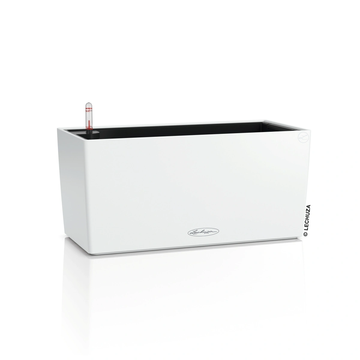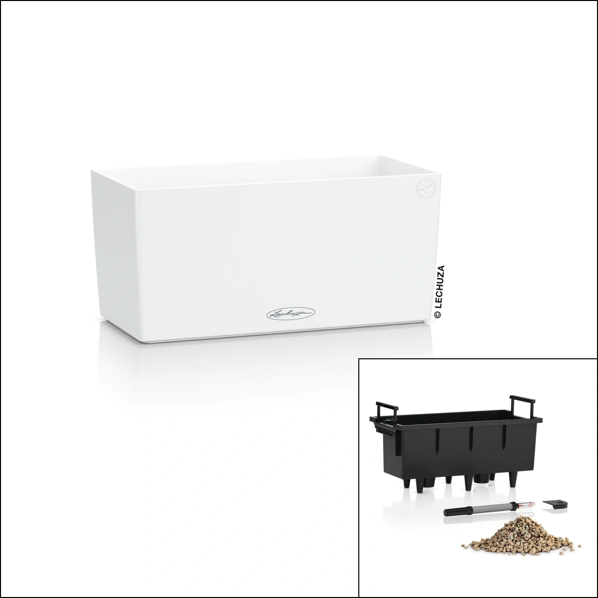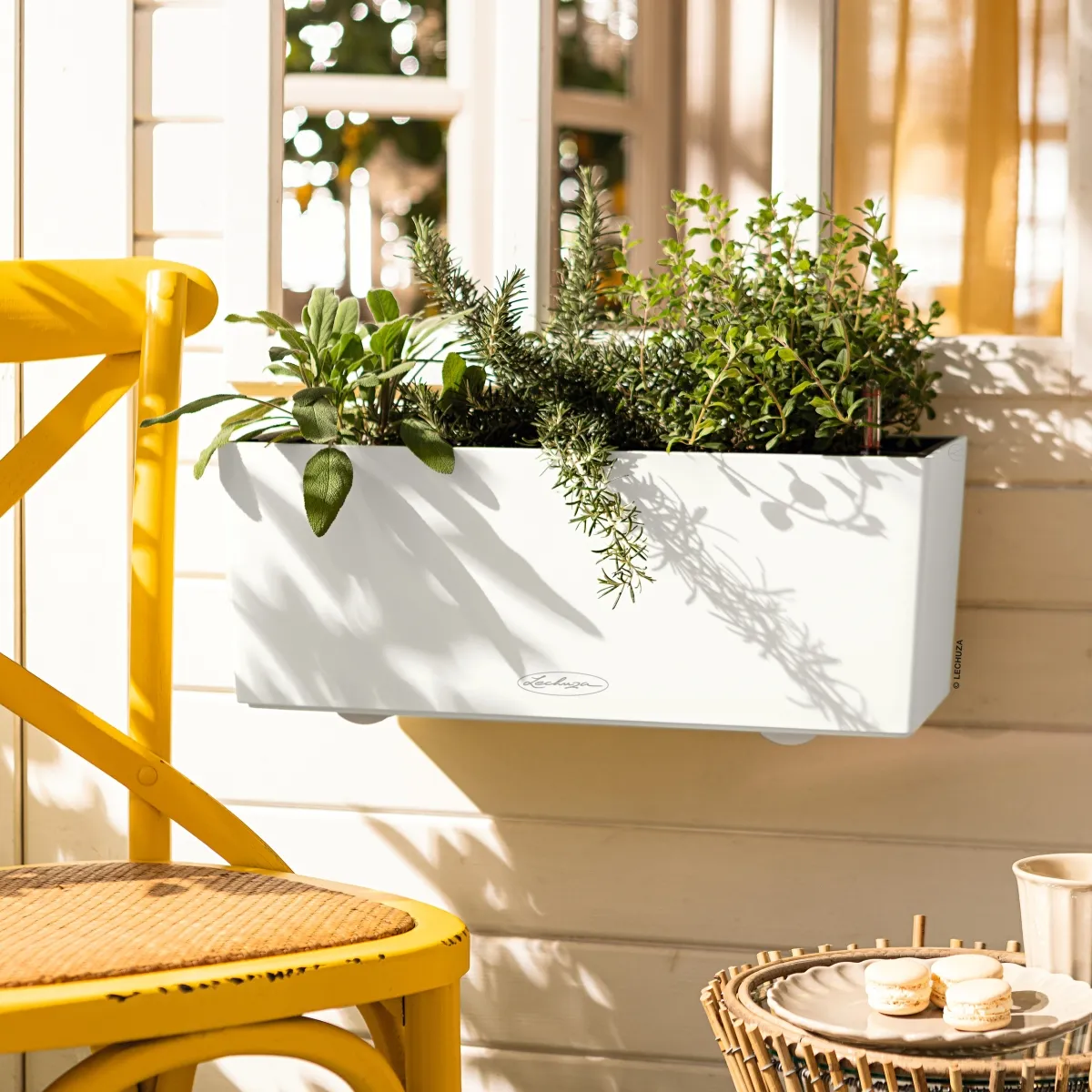 Zintegrowany system nawadniania LECHUZA dostosowany do mniejszych nasadzeń, wyjmowany wkład ułatwiający sadzenie i pielęgnację roślin, zbiornik na wodę ze wskaźnikiem poziomu, matowe wykończenie w kolorze białym, odporność na warunki atmosferyczne i promieniowanie UV, możliwość montażu na balustradzie balkonowej przy użyciu dedykowanych uchwytów (nie w zestawie).