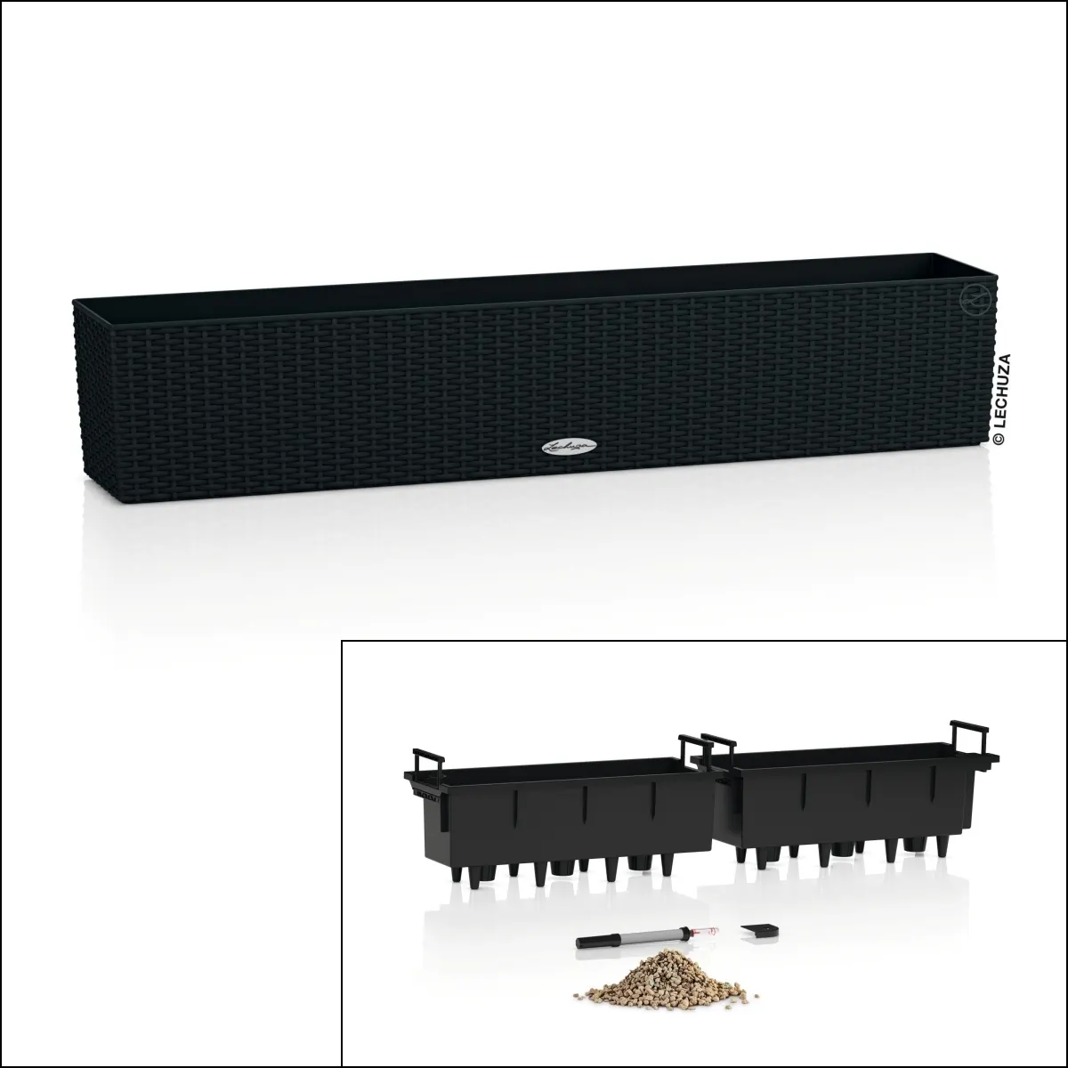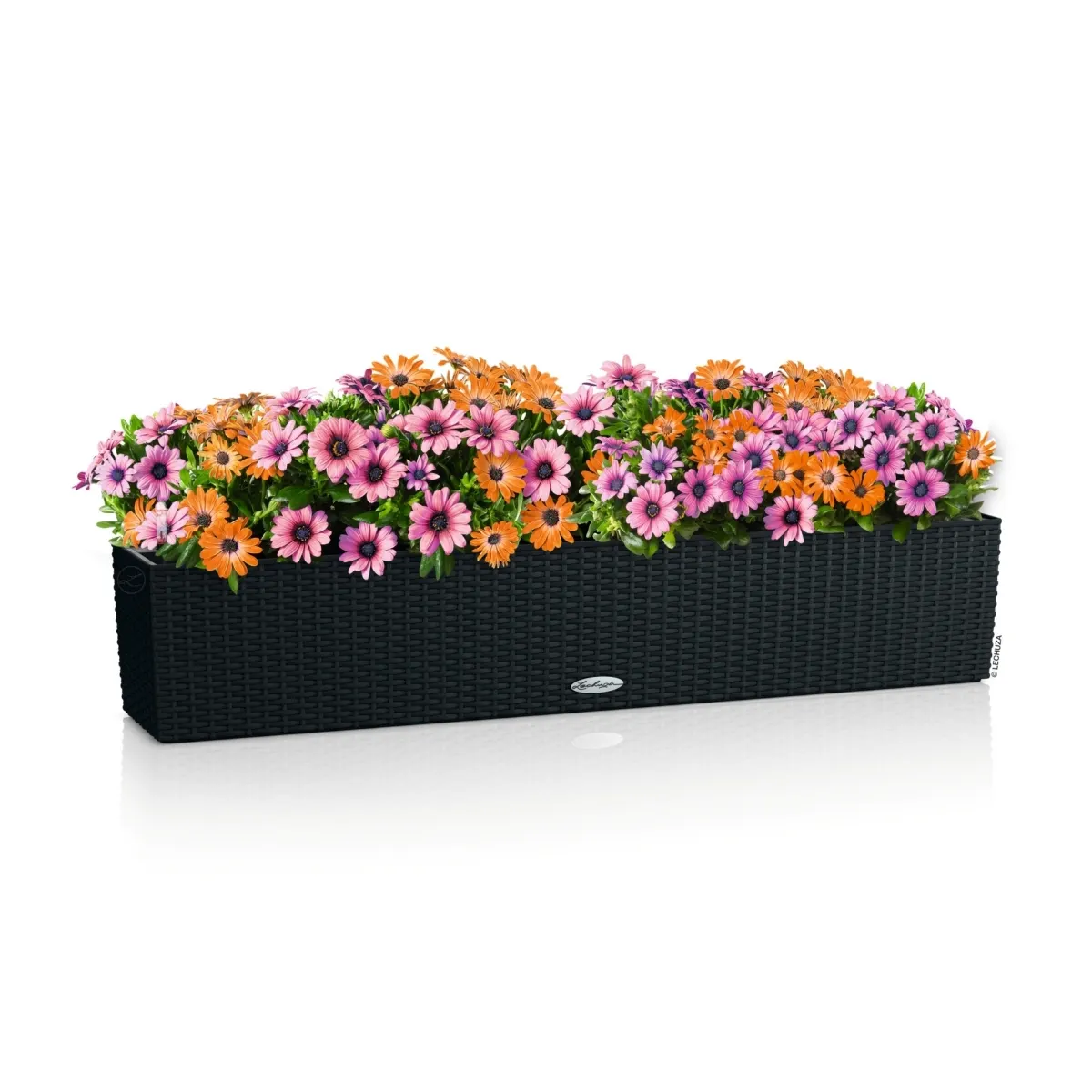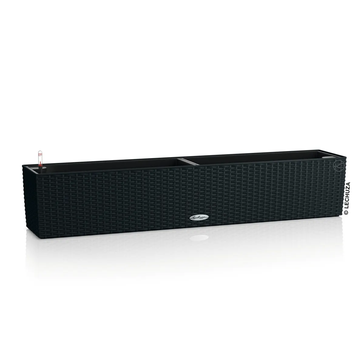 LECHUZA BALCONERA Cottage 100 w kolorze grafitowy czarny to doniczka na balkon i taras z systemem nawadniania, zaprojektowana z myślą o nowoczesnych przestrzeniach, w których rośliny mają podkreślać rytm architektury. Wydłużona, wyraźna forma w połączeniu z dekoracyjną strukturą serii Trend Cottage nadaje aranżacji zdecydowany charakter i pozwala budować czytelne, liniowe kompozycje. Głęboki grafit stanowi kontrastowe tło dla zieleni, porządkując przestrzeń i nadając jej nowoczesną elegancję.