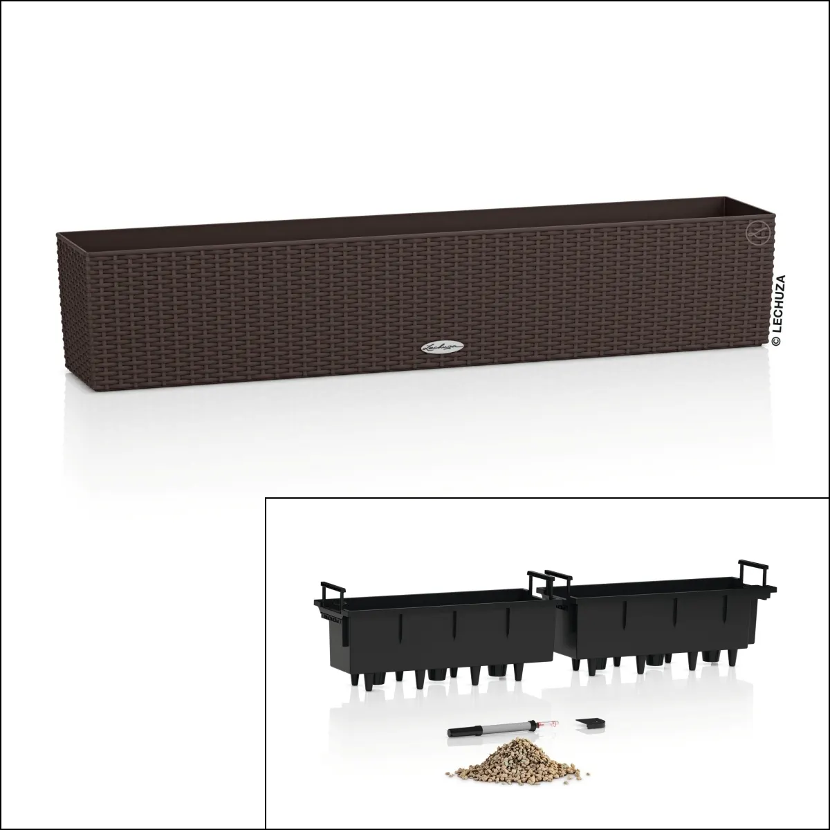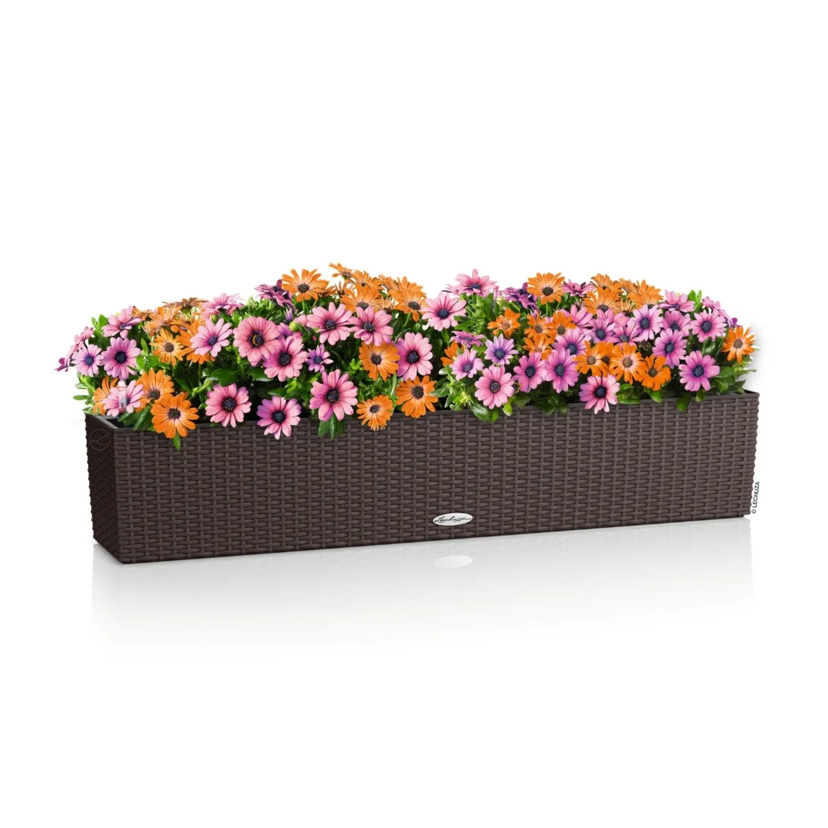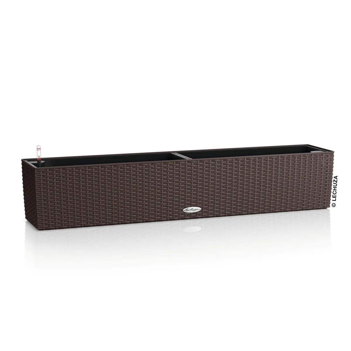 LECHUZA BALCONERA Cottage 100 w kolorze mokka to doniczka na balkon i taras z systemem nawadniania, zaprojektowana z myślą o użytkownikach, którzy chcą stworzyć roślinną aranżację raz i korzystać z niej przez długi czas bez ciągłych zmian. Wydłużona forma donicy oraz dekoracyjna struktura technoratanu serii Trend Cottage sprzyjają spokojnym, harmonijnym kompozycjom, które nie dominują przestrzeni, lecz naturalnie ją uzupełniają. Brązowy kolor w odcieniu mokka wprowadza wizualne ocieplenie i sprawia, że balkon lub taras staje się jeszcze bardziej przyjaznym miejscem codziennego odpoczynku.