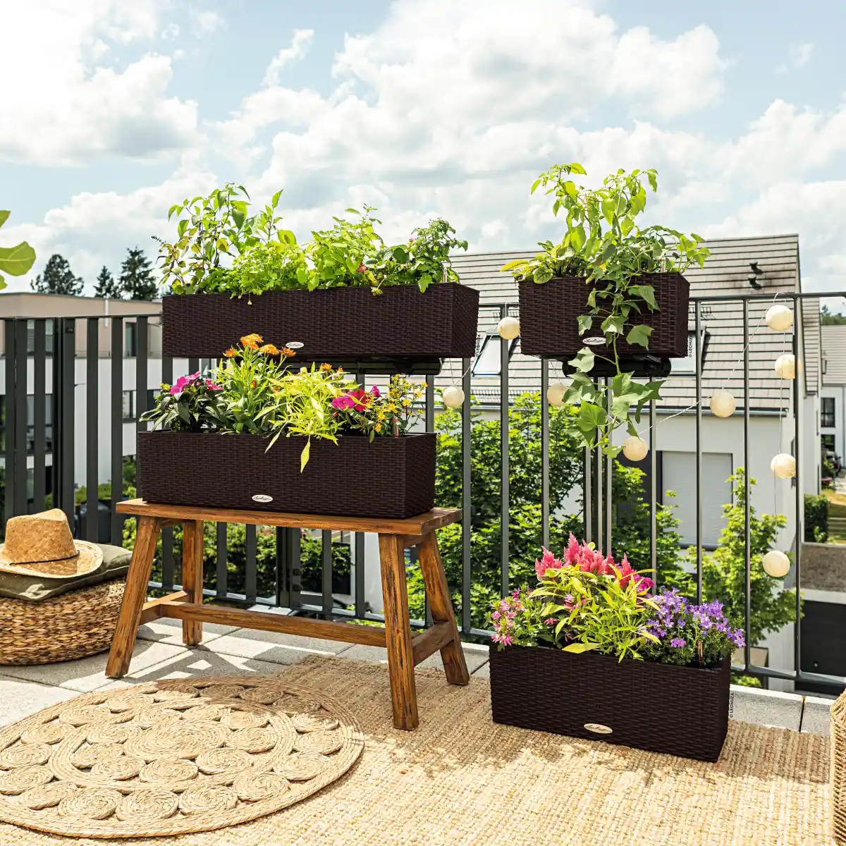 LECHUZA BALCONERA Cottage 40 w kolorze grafitowy czarny to nowoczesna donicza na balkon z systemem nawadniania, kompaktowa propozycja do miejskich aranżacji oraz wyrazisty element porządkujący przestrzeń balkonową. Stonowana, ciemna kolorystyka nadaje aranżacji głębi i charakteru, a dekoracyjna powierzchnia typowa dla serii Trend Cottage wprowadza subtelny efekt struktury technoratanu. To doniczka zaprojektowana z myślą o balkonach, na których rośliny są nie tylko dodatkiem, ale istotnym elementem kompozycji.
