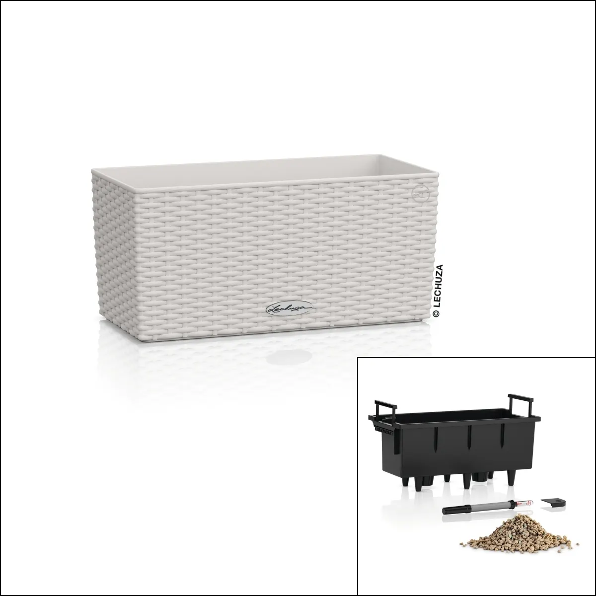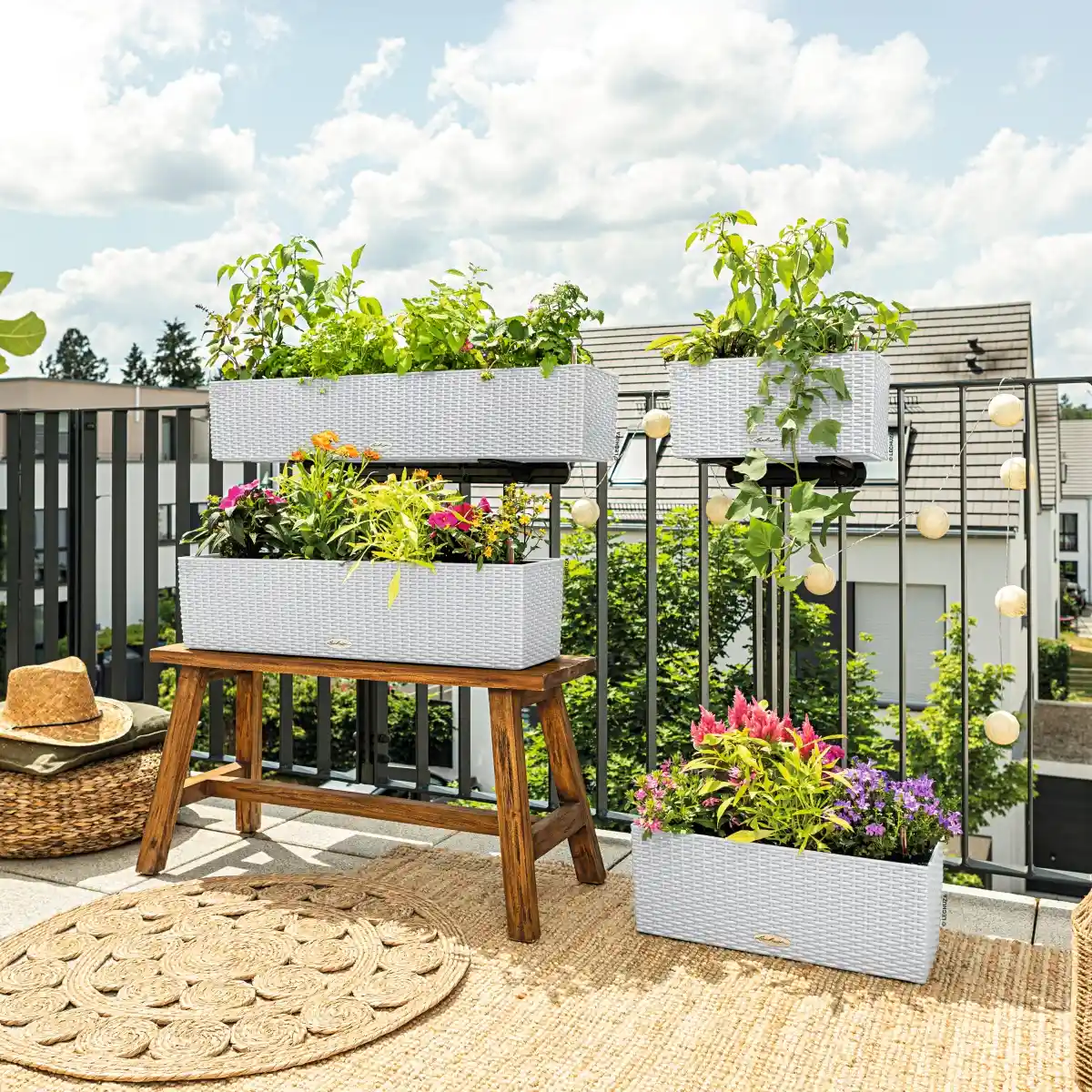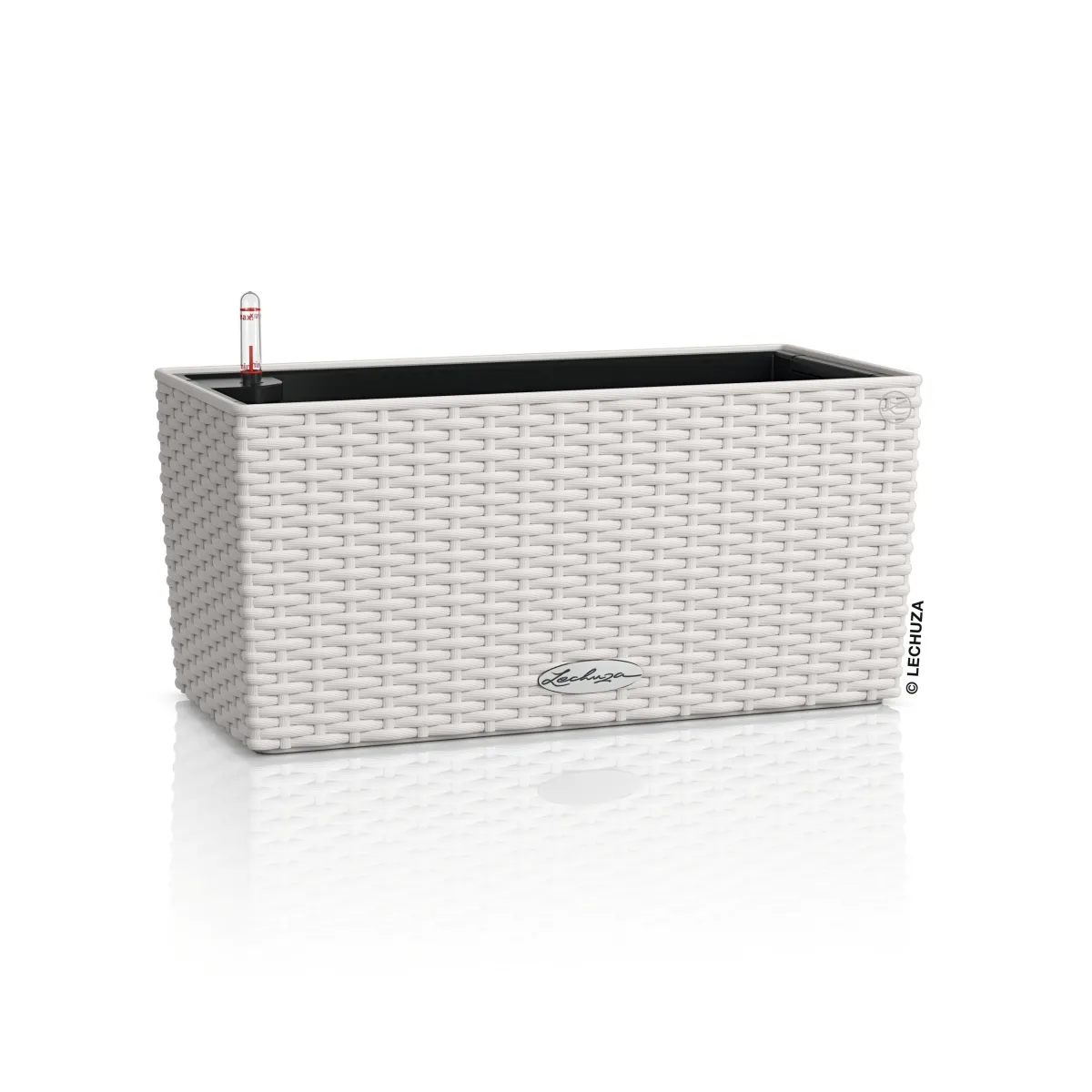 LECHUZA BALCONERA Cottage 40 w kolorze jasny szary to elegancka doniczka na balkon z systemem nawadniania, kompaktowy model LECHUZA do codziennego użytkowania oraz naturalny element aranżacji opartych na harmonii i spokoju. Delikatny, jasnoszary odcień w połączeniu z dekoracyjną strukturą technoratanu serii Trend Cottage wprowadza do przestrzeni wizualną lekkość i porządek. To donica zaprojektowana z myślą o balkonach i tarasach, na których rośliny mają podkreślać styl przestrzeni, a nie dominować nad nią.