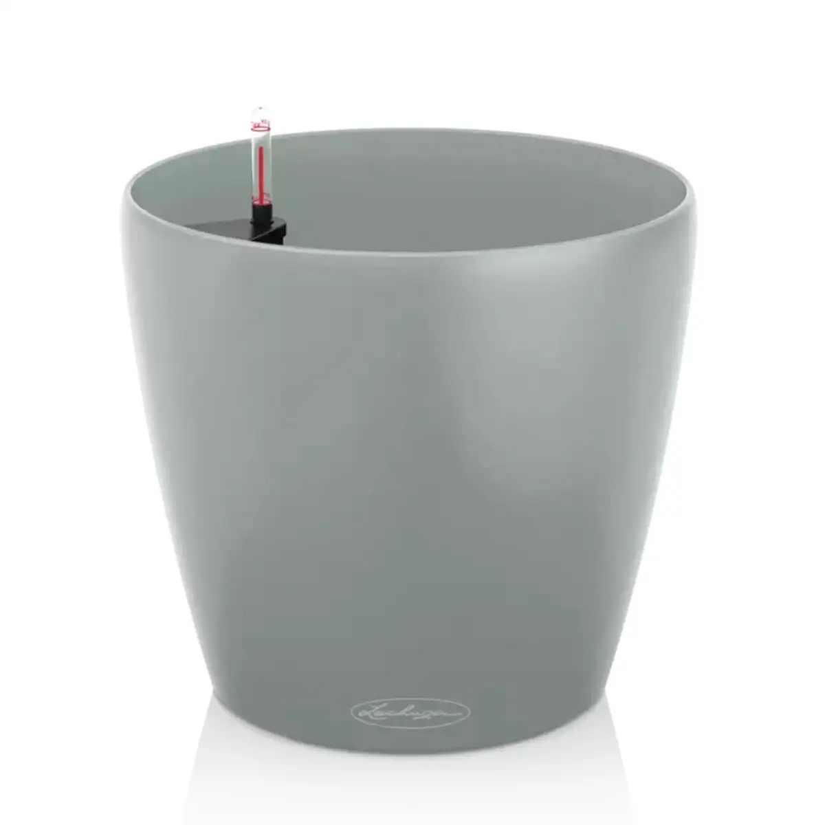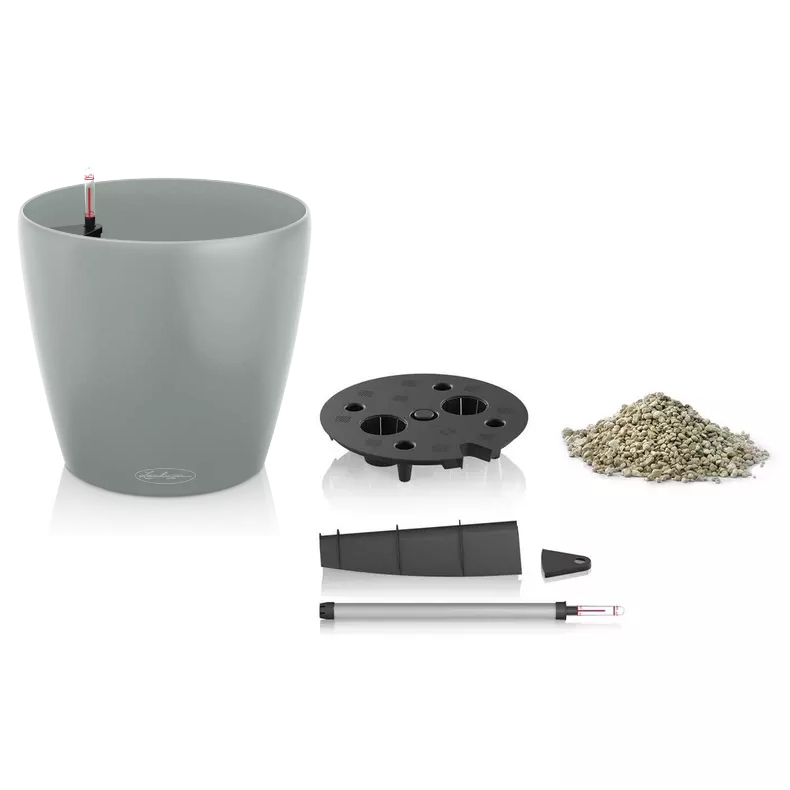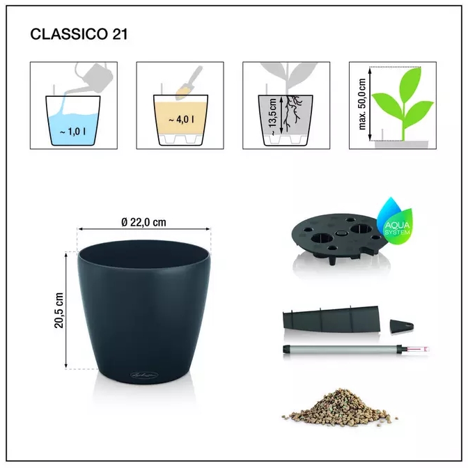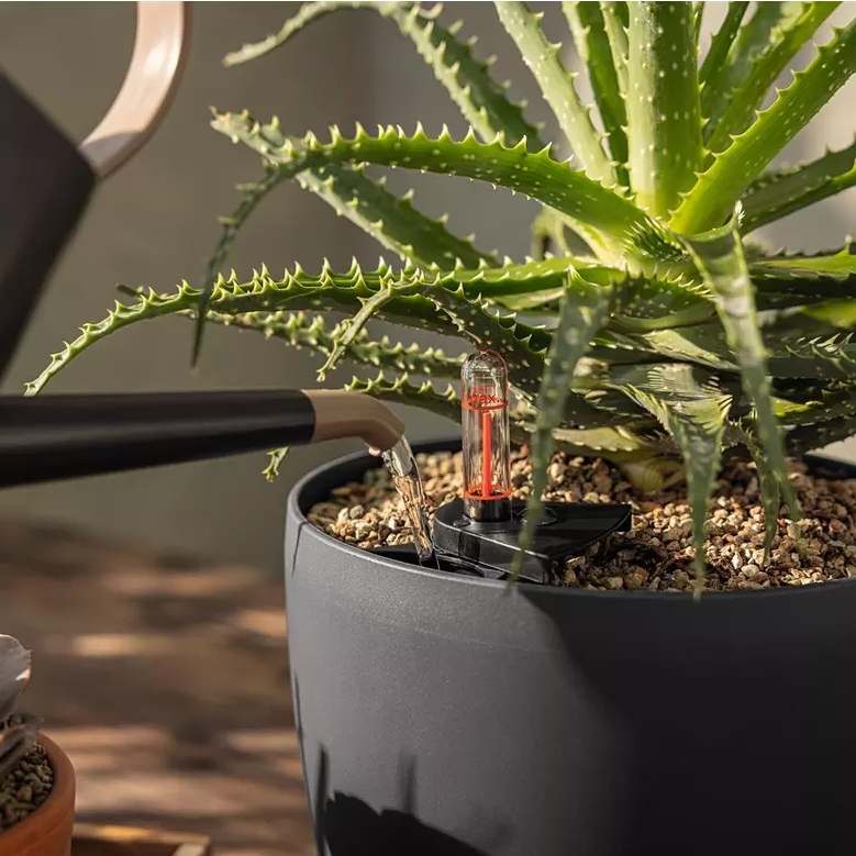 Model CLASSICO Color 21 wyposażony jest w system nawadniania LECHUZA, który pomaga utrzymać odpowiedni poziom wilgotności podłoża. W dolnej części donicy znajduje się zasobnik wody o pojemności 1 litra, z którego rośliny mogą stopniowo pobierać wilgoć w miarę swoich potrzeb. Rozwiązanie to wspiera stabilne warunki wzrostu roślin i ogranicza konieczność częstego podlewania. Wskaźnik poziomu wody umożliwia łatwą kontrolę ilości wody w donicy, dzięki czemu pielęgnacja roślin staje się prostsza i bardziej przewidywalna.