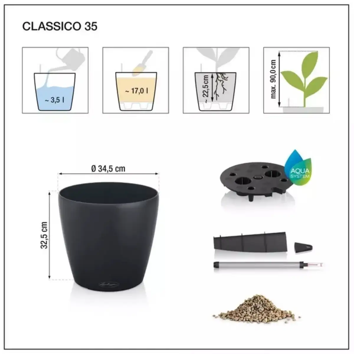 CLASSICO Color 35 została wyposażona w system nawadniania LECHUZA, który pomaga utrzymać odpowiednią wilgotność podłoża przez dłuższy czas. W dolnej części donicy znajduje się zasobnik wody o pojemności 3,5 litra, dzięki któremu rośliny mogą pobierać wodę stopniowo, w zależności od swoich potrzeb. Takie rozwiązanie sprzyja stabilnemu rozwojowi roślin i ułatwia codzienną pielęgnację. Wskaźnik poziomu wody umożliwia wygodną kontrolę ilości wody w systemie.