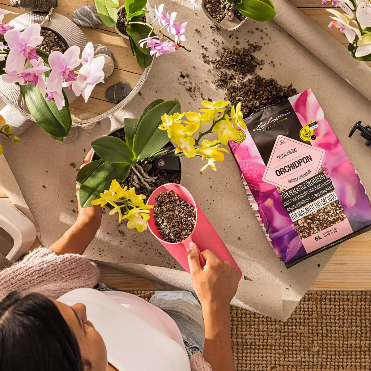 Storczyki wymagają podłoża, które nie zatrzymuje nadmiaru wilgoci i jednocześnie umożliwia swobodny przepływ powietrza wokół korzeni. LECHUZA ORCHIDPON składa się z mieszanki kory sosnowej, pumeksu i lawy wulkanicznej, dzięki czemu podłoże pozostaje lekkie, przewiewne i stabilne. Taka struktura sprzyja zdrowemu rozwojowi korzeni powietrznych i ogranicza ryzyko ich osłabienia.