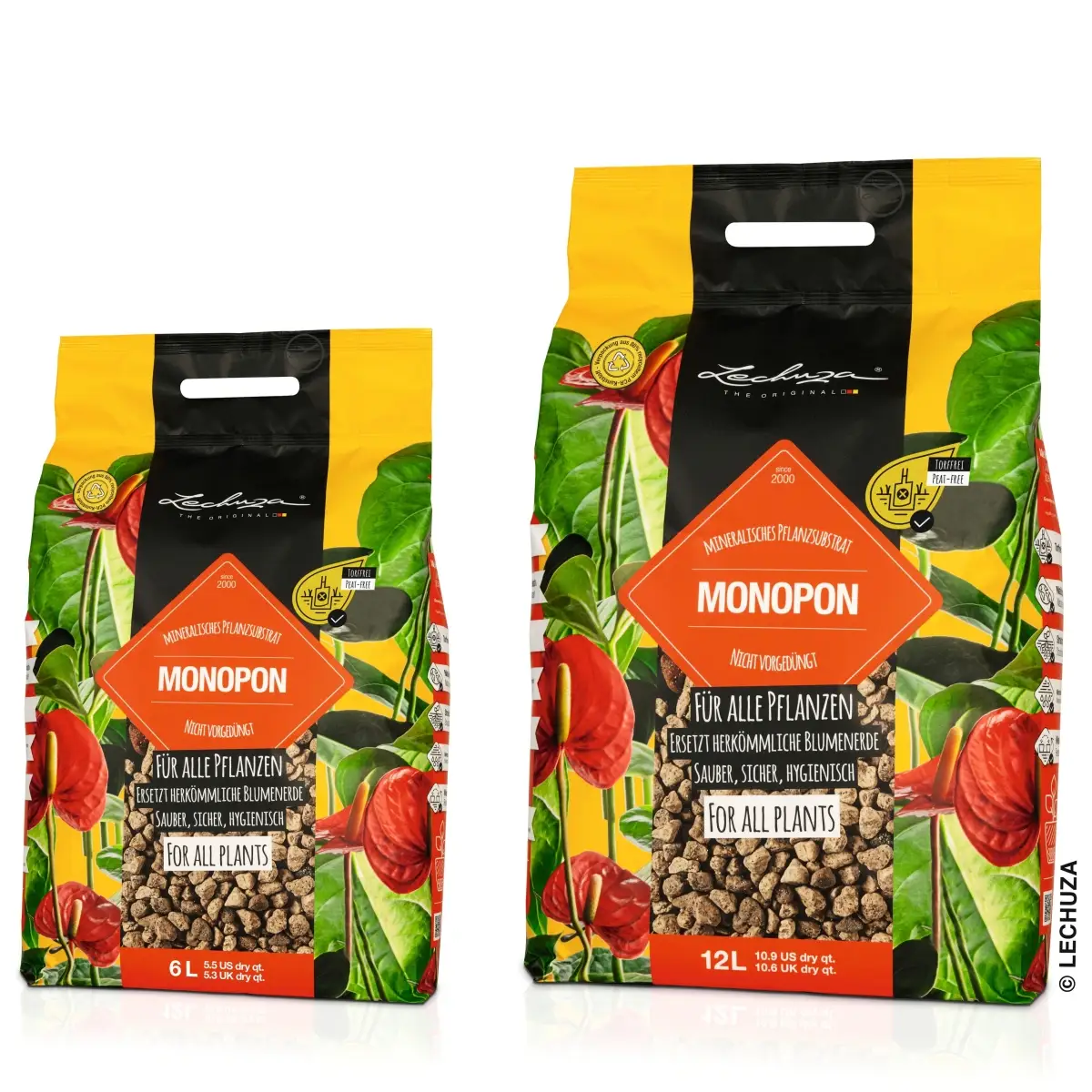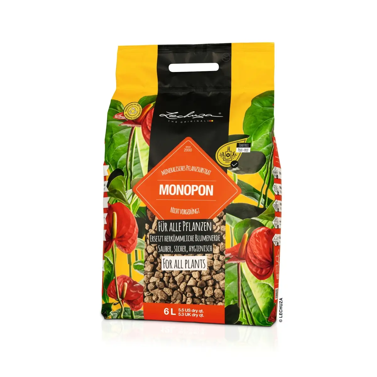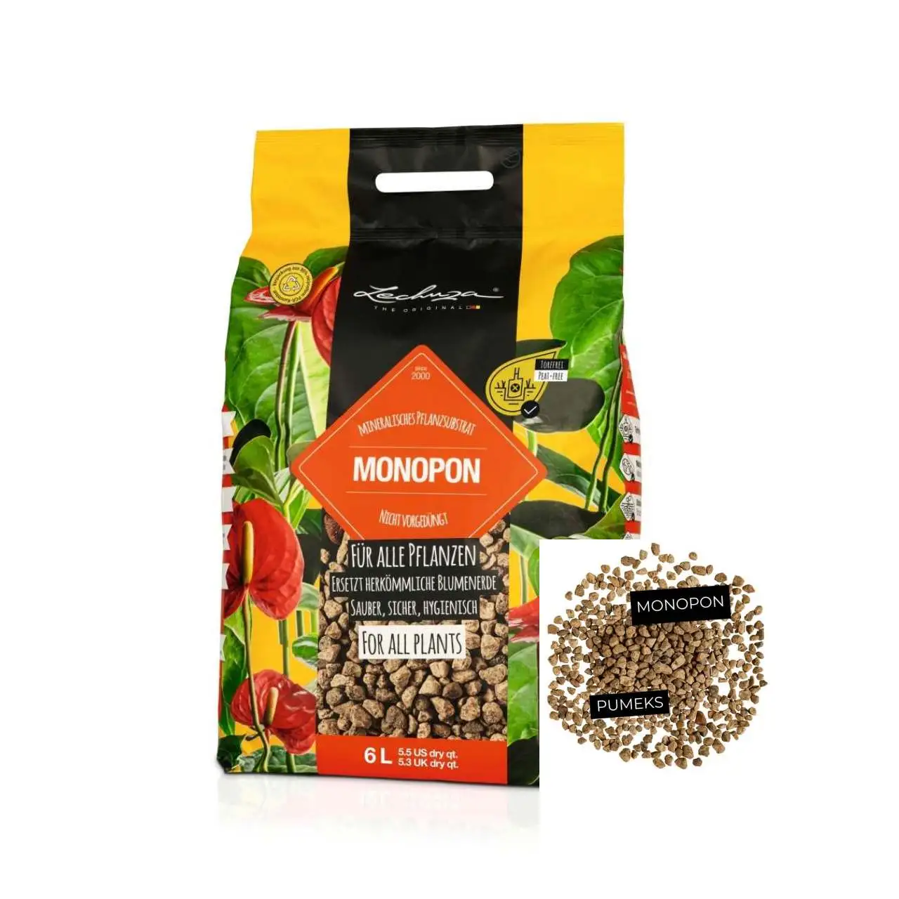LECHUZA MONOPON to mineralne podłoże wykonane w 100% z naturalnego pumeksu, zaprojektowane jako nowoczesna alternatywa dla keramzytu oraz klasycznych podłoży hydroponicznych. MONOPON zapewnia korzeniom doskonałe napowietrzenie oraz stabilne warunki wilgotnościowe, wspierając zdrowy rozwój roślin.